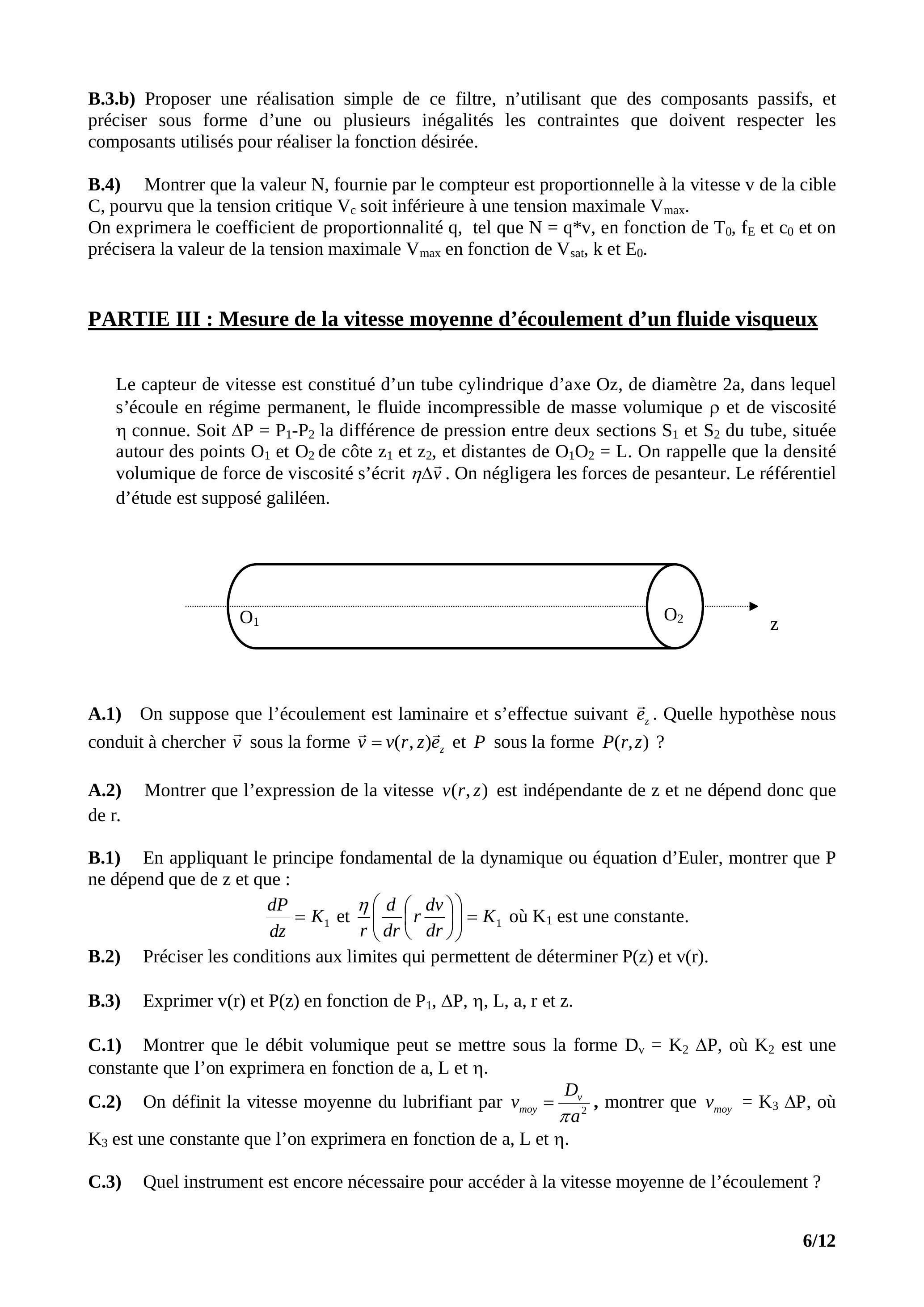 Le capteur de vitesse est constitué d'un tube cylindrique d'axe Oz, de diamètre 2a, dans lequel s'écoule en régime permanent, le fluide incompressible de masse volumique et de viscosité connue. Soit la différence de pression entre deux sections et du tube, située autour des points et de côte et , et distantes de . On rappelle que la densité volumique de force de viscosité s'écrit . On négligera les forces de pesanteur. Le référentiel d'étude est supposé galiléen.