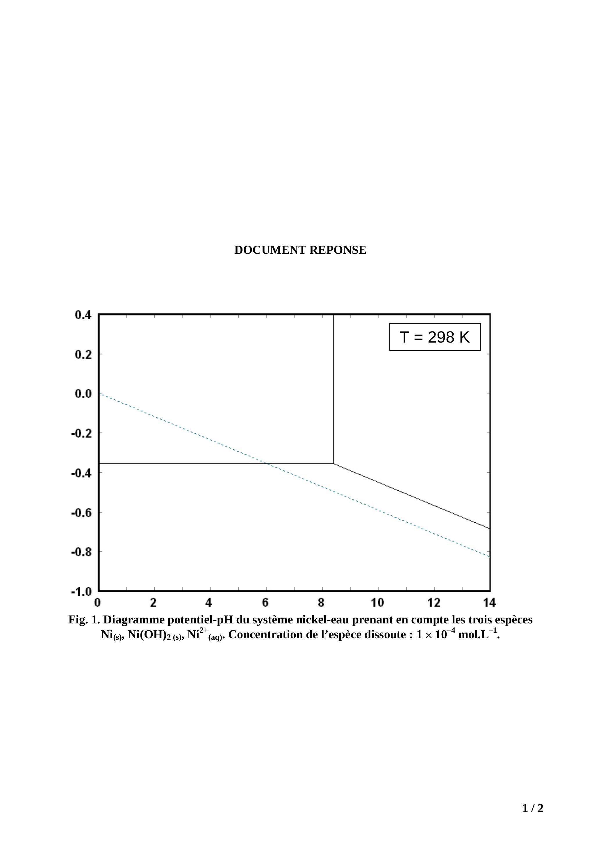 IV.6. La Figure 1 du document réponse présente le diagramme potentiel-pH muet du système nickel-eau à pour une concentration de égale à mol. . Y porter les noms des espèces de chaque domaine, en précisant selon le cas : «domaine d'existence de ... » ou «domaine de prédominance de ... ». Identifier le couple redox correspondant à la droite en pointillés. Placer la courbe relative au couple dans les conditions précisées ci-dessus.