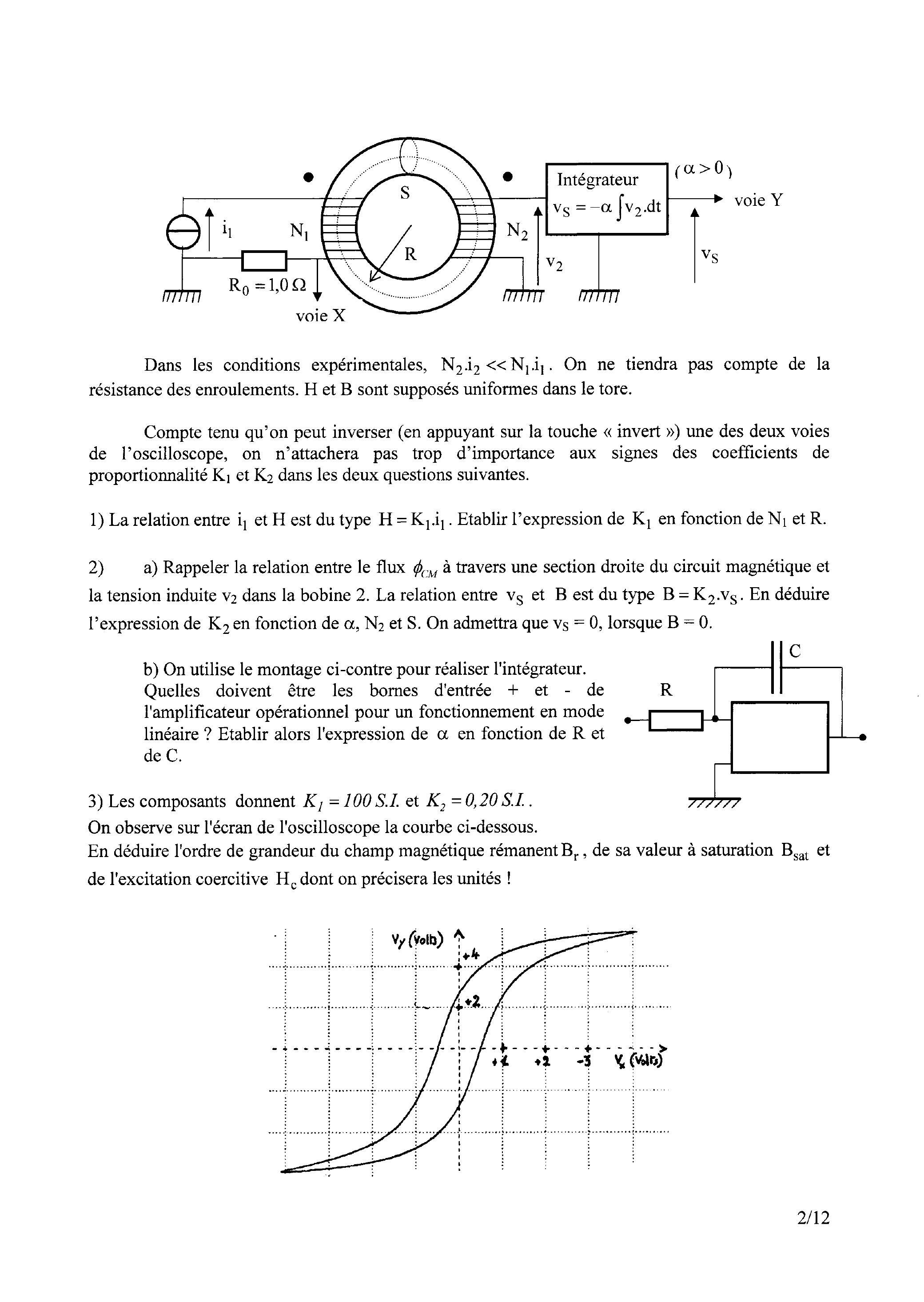 On désire tracer expérimentalement le cycle d'Hystérésis d'un matériau se présentant sous la forme d'un tore sur lequel sont bobinés deux enroulements. On note son rayon moyen et S sa section.