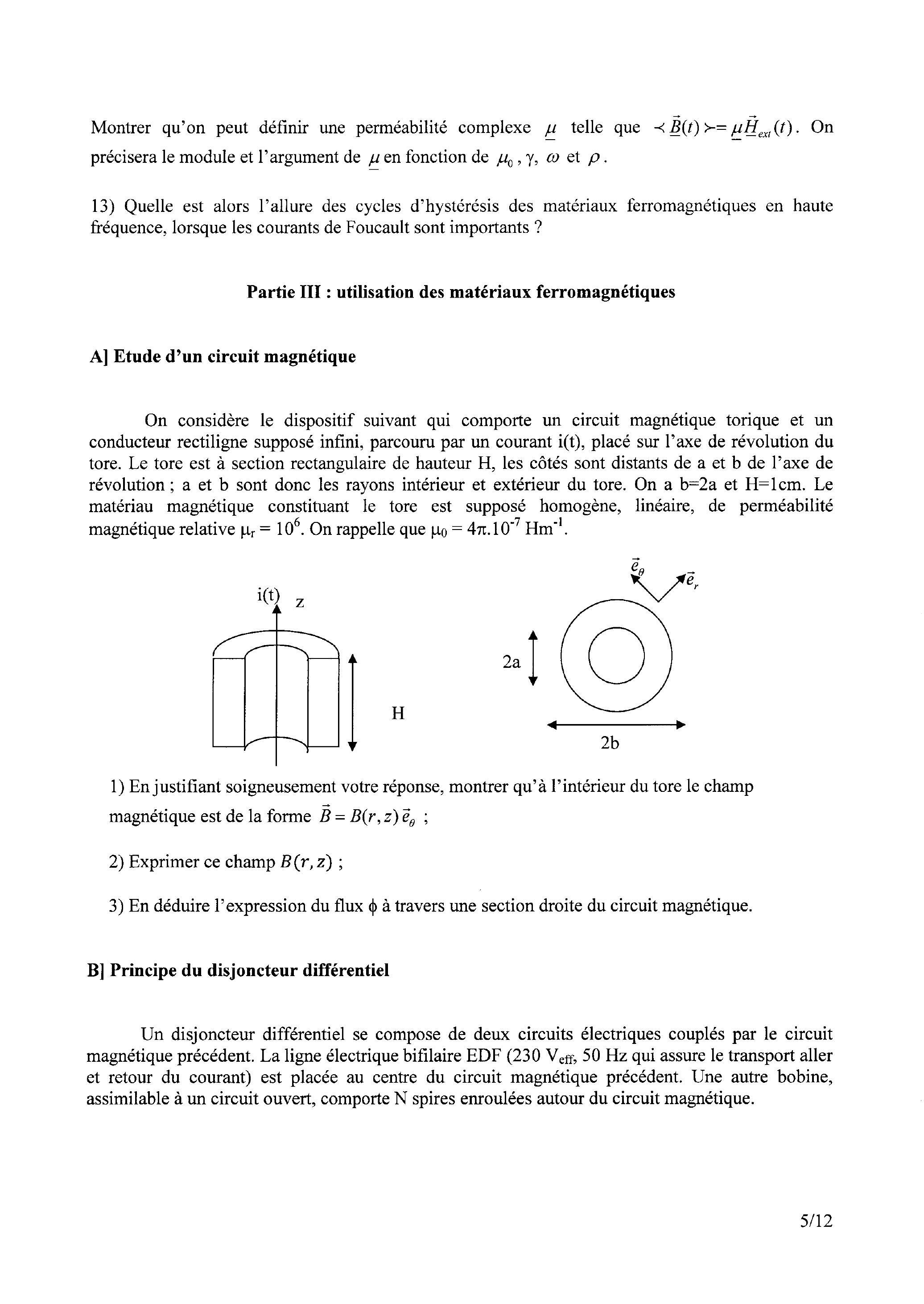 On considère le dispositif suivant qui comporte un circuit magnétique torique et un conducteur rectiligne supposé infini, parcouru par un courant , placé sur l'axe de révolution du tore. Le tore est à section rectangulaire de hauteur H , les côtés sont distants de a et b de l'axe de révolution; et sont donc les rayons intérieur et extérieur du tore. On et . Le matériau magnétique constituant le tore est supposé homogène, linéaire, de perméabilité magnétique relative . On rappelle que .