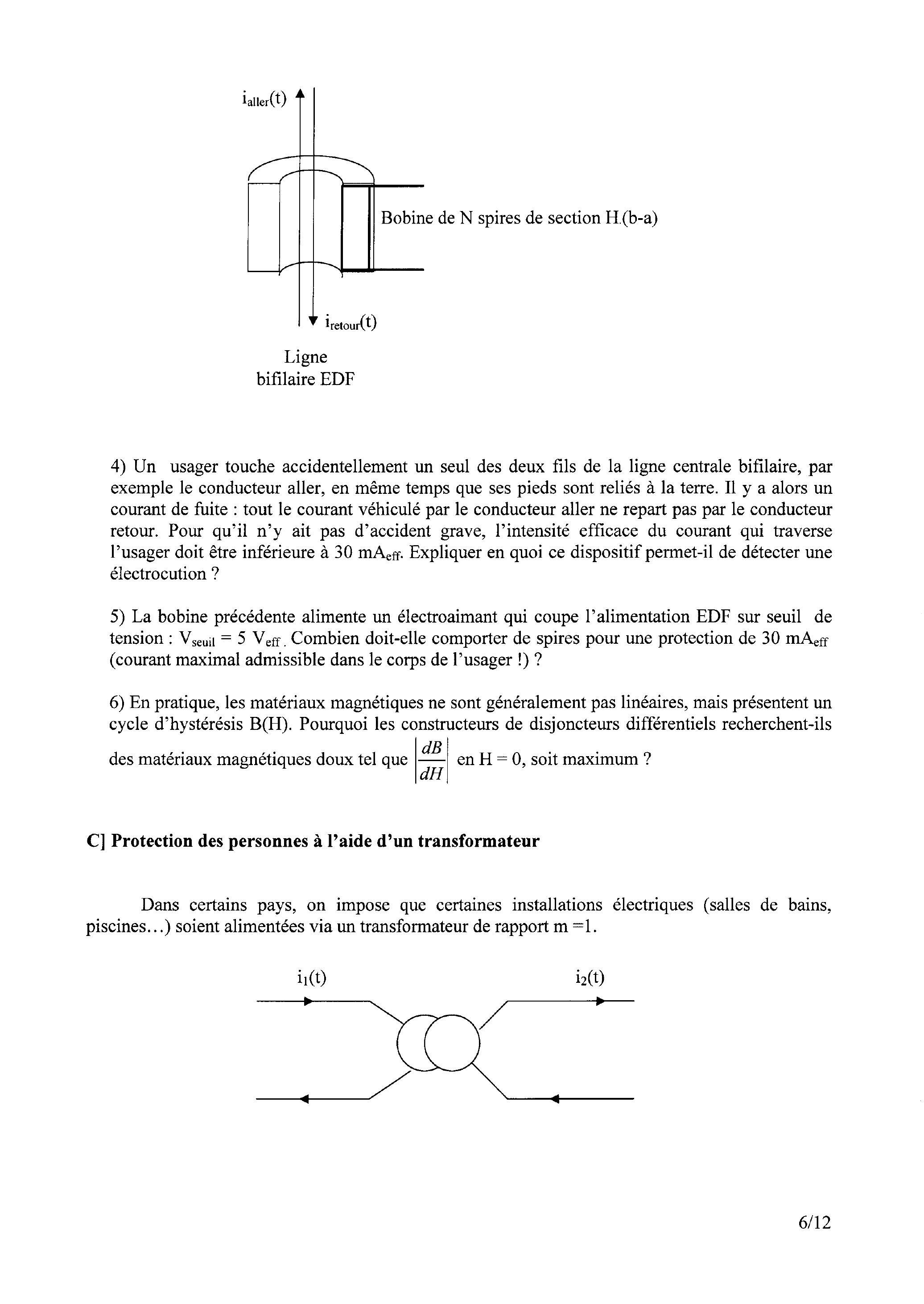 2. La bobine précédente alimente un électroaimant qui coupe l'alimentation EDF sur seuil de tension : . Combien doit-elle comporter de spires pour une protection de (courant maximal admissible dans le corps de l'usager !) ?