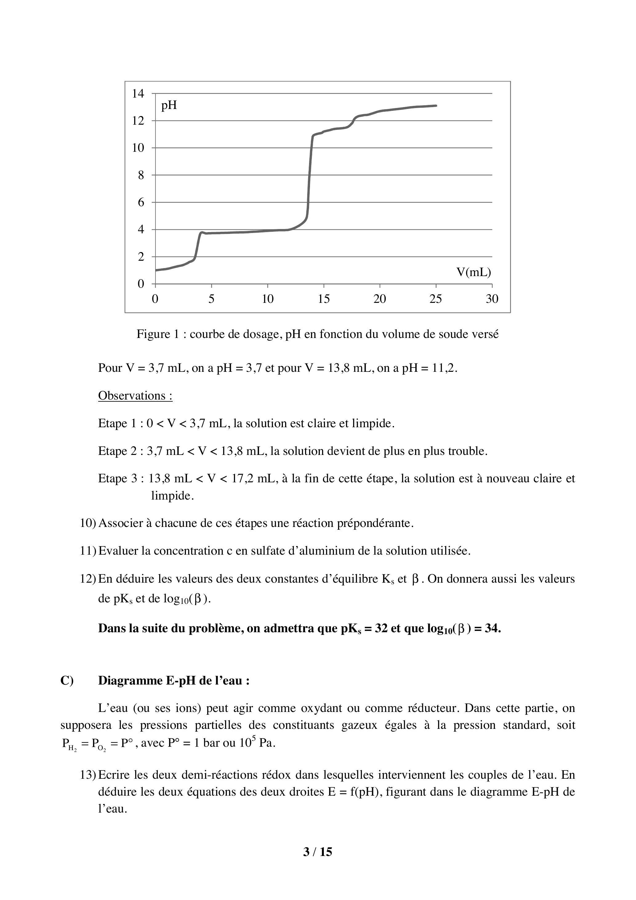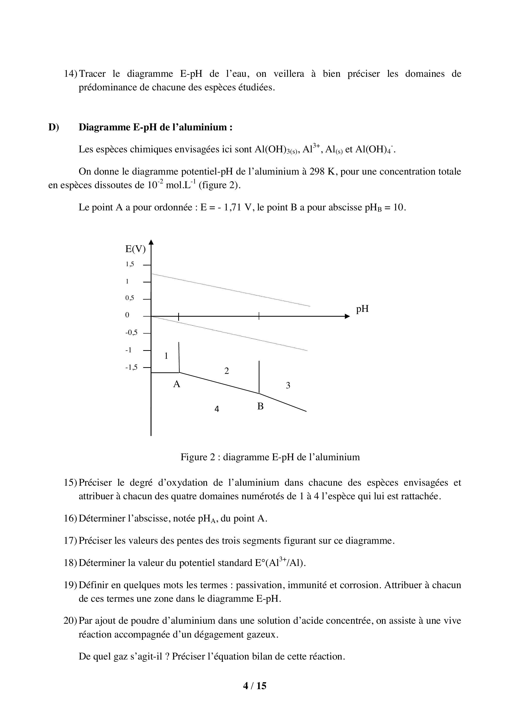 On donne le diagramme potentiel-pH de l'aluminium à 298 K , pour une concentration totale en espèces dissoutes de mol. (figure 2).