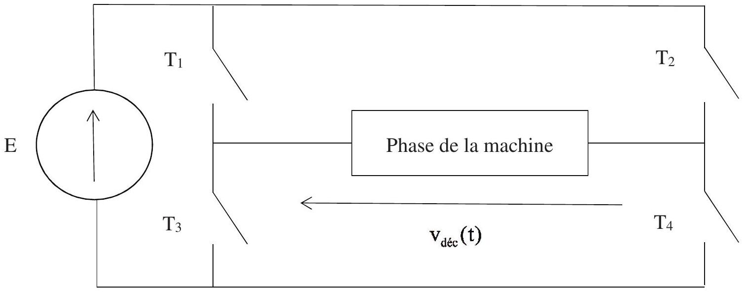 L'onduleur de tension (figure 6) à Modulation de Largeur d'Impulsion, qui alimente une phase de la machine, possède quatre interrupteurs électroniques. Il est relié en entrée à la source de tension continue E (batterie).
