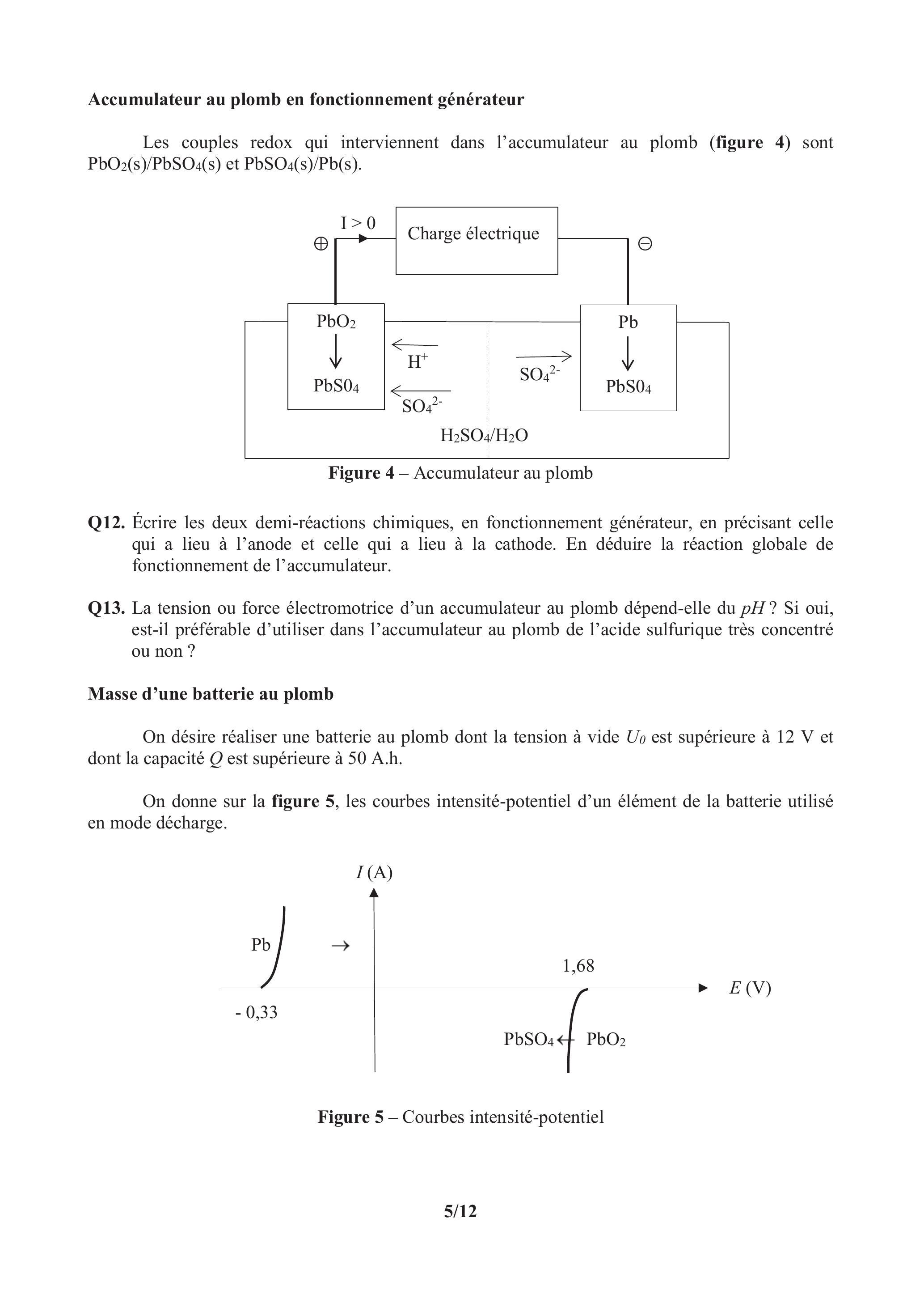 Q12. Écrire les deux demi-réactions chimiques, en fonctionnement générateur, en précisant celle qui a lieu à l'anode et celle qui a lieu à la cathode. En déduire la réaction globale de fonctionnement de l'accumulateur.