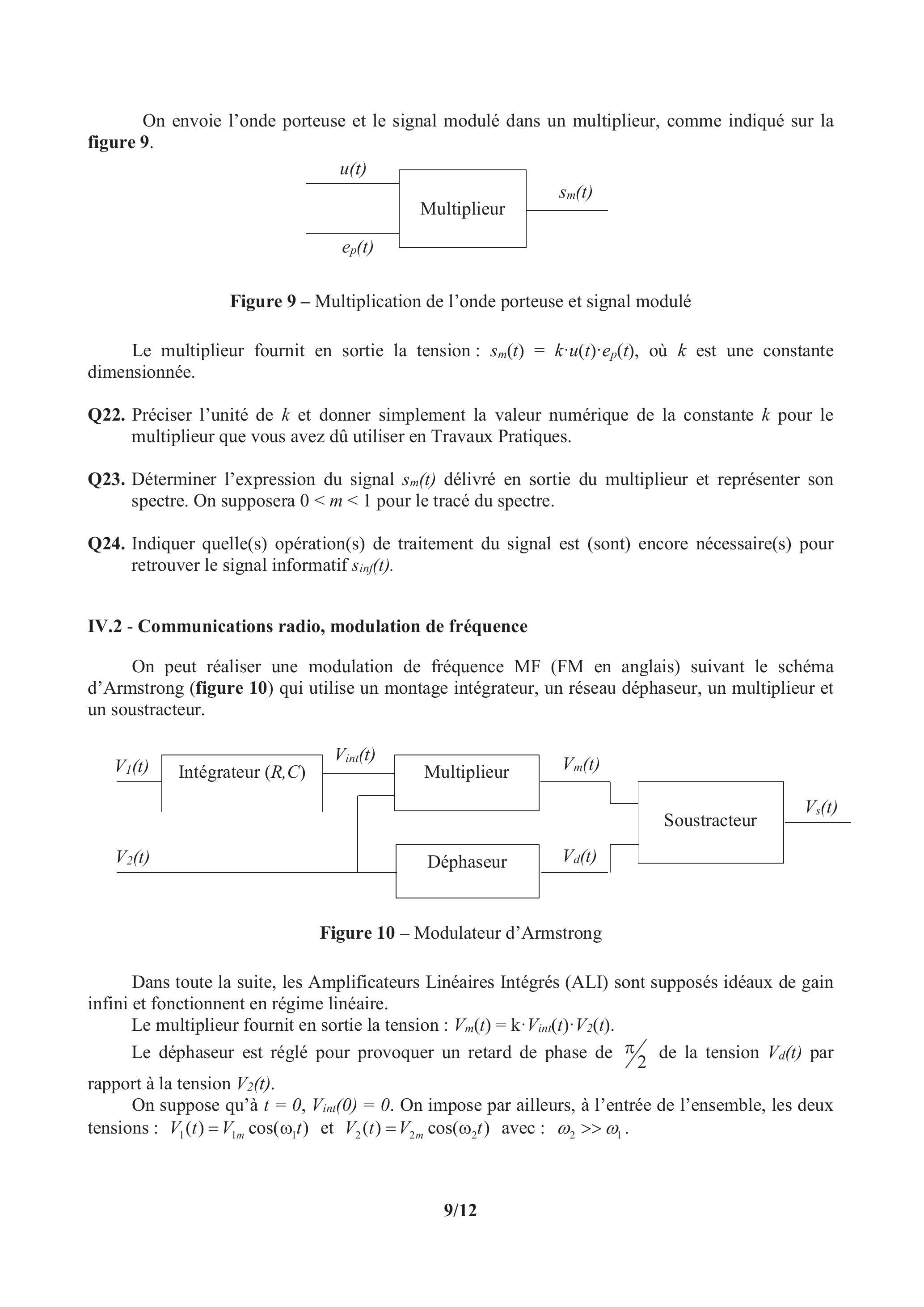 On peut réaliser une modulation de fréquence MF (FM en anglais) suivant le schéma d'Armstrong (figure 10) qui utilise un montage intégrateur, un réseau déphaseur, un multiplieur et un soustracteur.