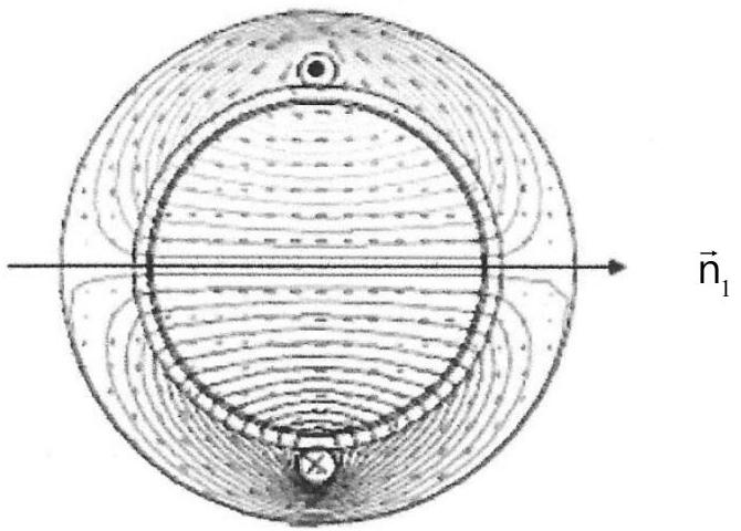. La spire est représentée en coupe par son conducteur " aller " et son conducteur " retour ".