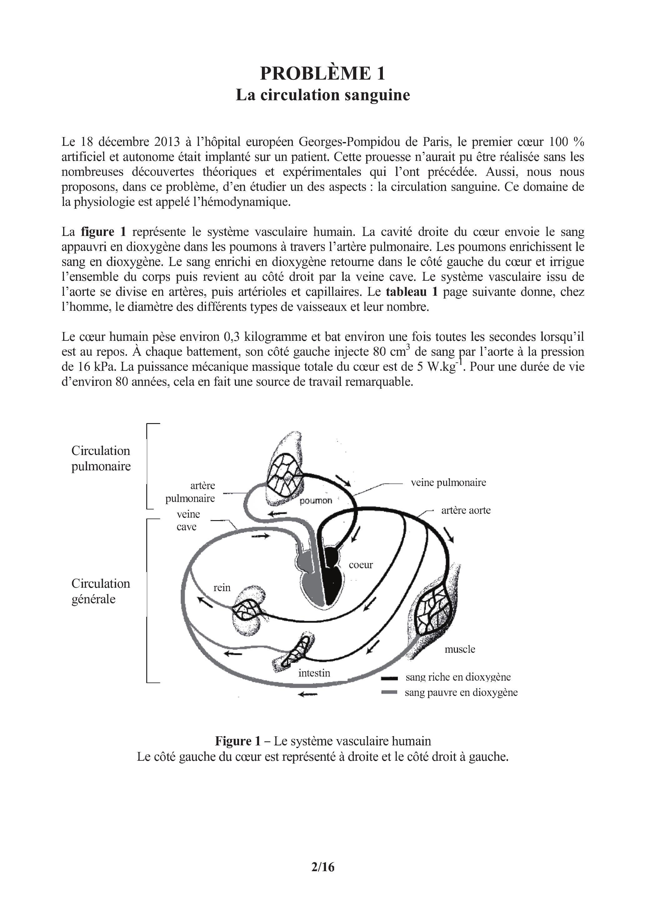 Le 18 décembre 2013 à l'hôpital européen Georges-Pompidou de Paris, le premier cœur 100 % artificiel et autonome était implanté sur un patient. Cette prouesse n'aurait pu être réalisée sans les nombreuses découvertes théoriques et expérimentales qui l'ont précédée. Aussi, nous nous proposons, dans ce problème, d'en étudier un des aspects : la circulation sanguine. Ce domaine de la physiologie est appelé l'hémodynamique.