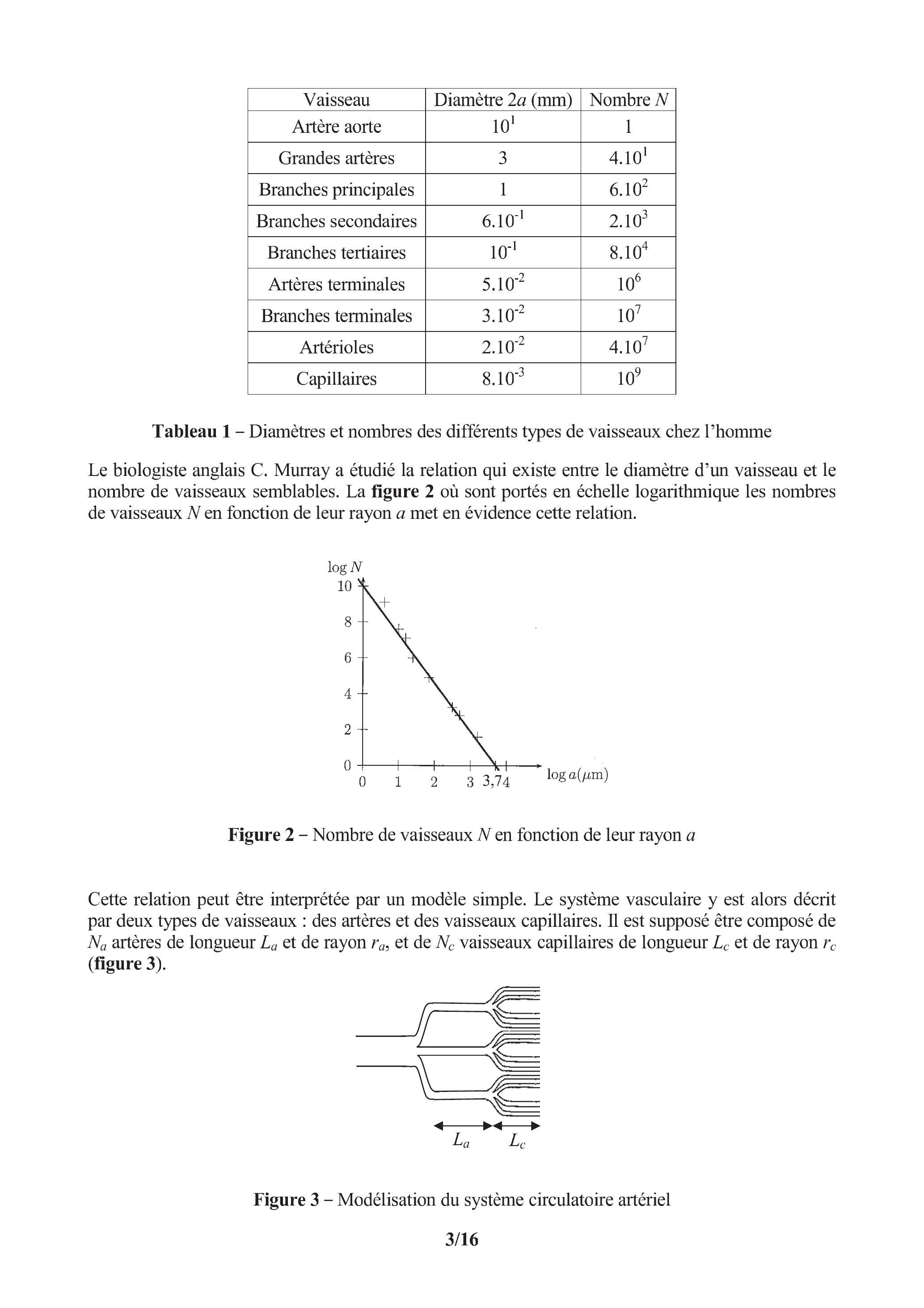 La figure 1 représente le système vasculaire humain. La cavité droite du cœur envoie le sang appauvri en dioxygène dans les poumons à travers l'artère pulmonaire. Les poumons enrichissent le sang en dioxygène. Le sang enrichi en dioxygène retourne dans le côté gauche du cœur et irrigue l'ensemble du corps puis revient au côté droit par la veine cave. Le système vasculaire issu de l'aorte se divise en artères, puis artérioles et capillaires. Le tableau 1 page suivante donne, chez l'homme, le diamètre des différents types de vaisseaux et leur nombre.