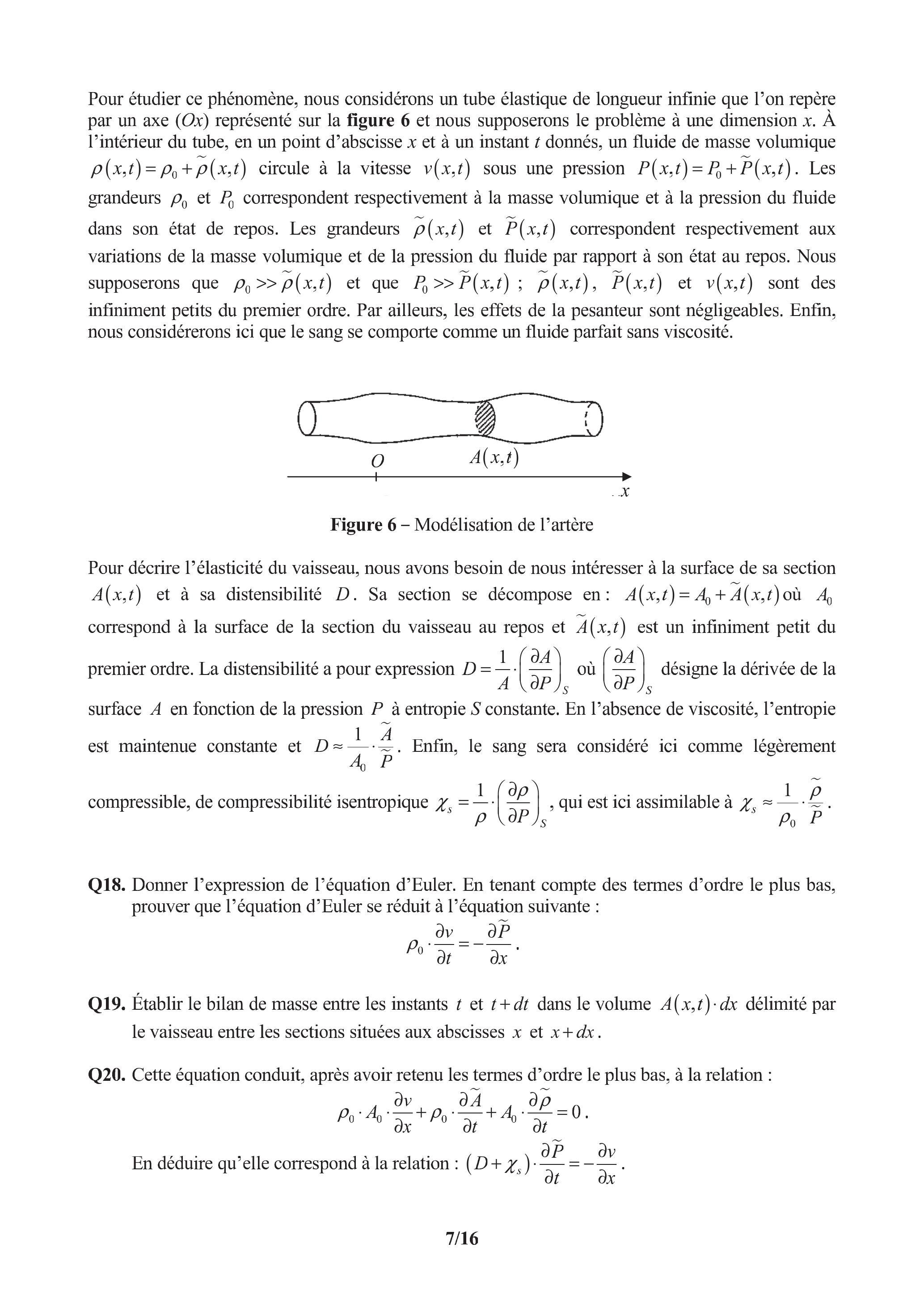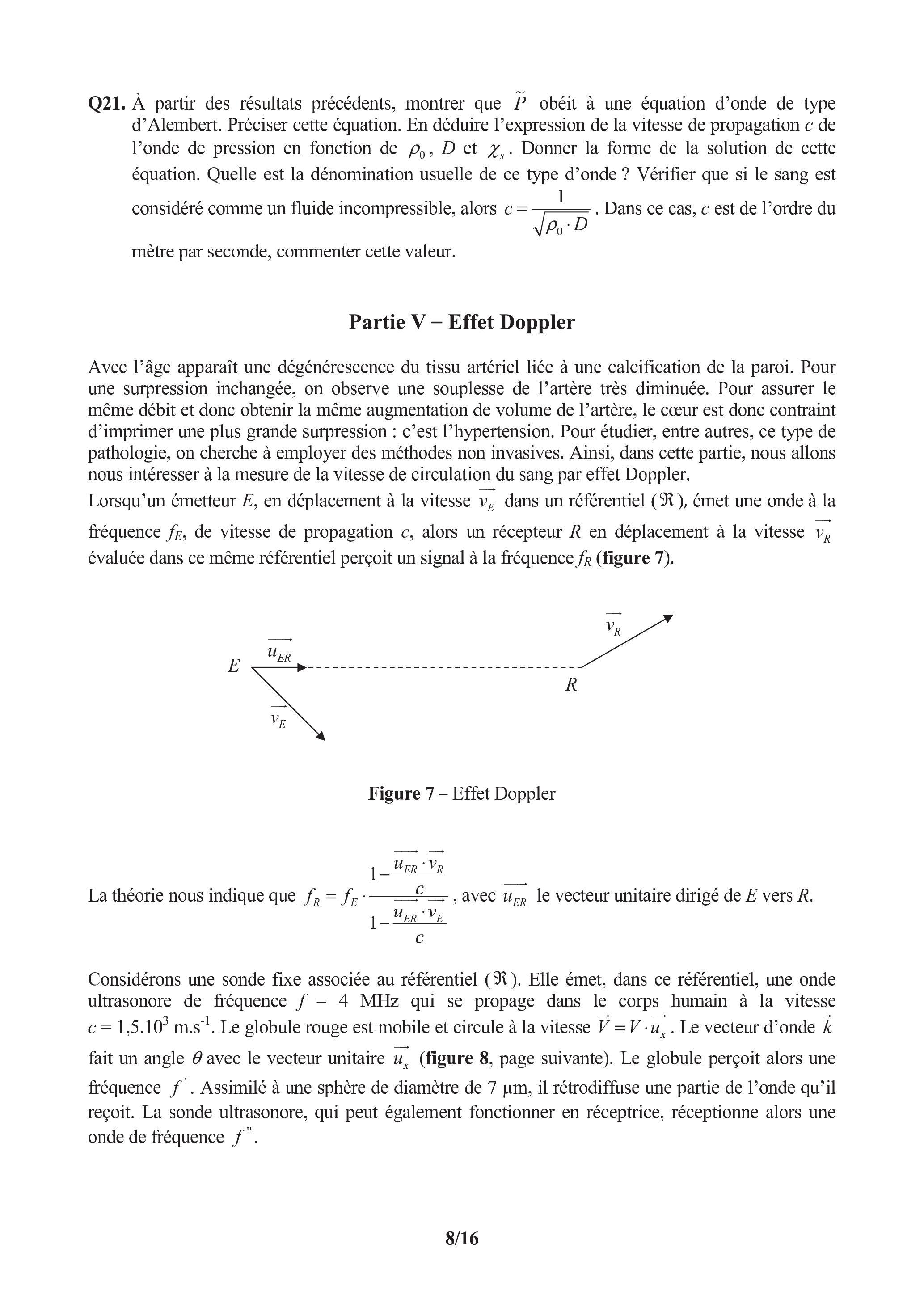Q21. À partir des résultats précédents, montrer que obéit à une équation d'onde de type d'Alembert. Préciser cette équation. En déduire l'expression de la vitesse de propagation de l'onde de pression en fonction de et . Donner la forme de la solution de cette équation. Quelle est la dénomination usuelle de ce type d'onde ? Vérifier que si le sang est considéré comme un fluide incompressible, alors . Dans ce cas, est de l'ordre du mètre par seconde, commenter cette valeur.
