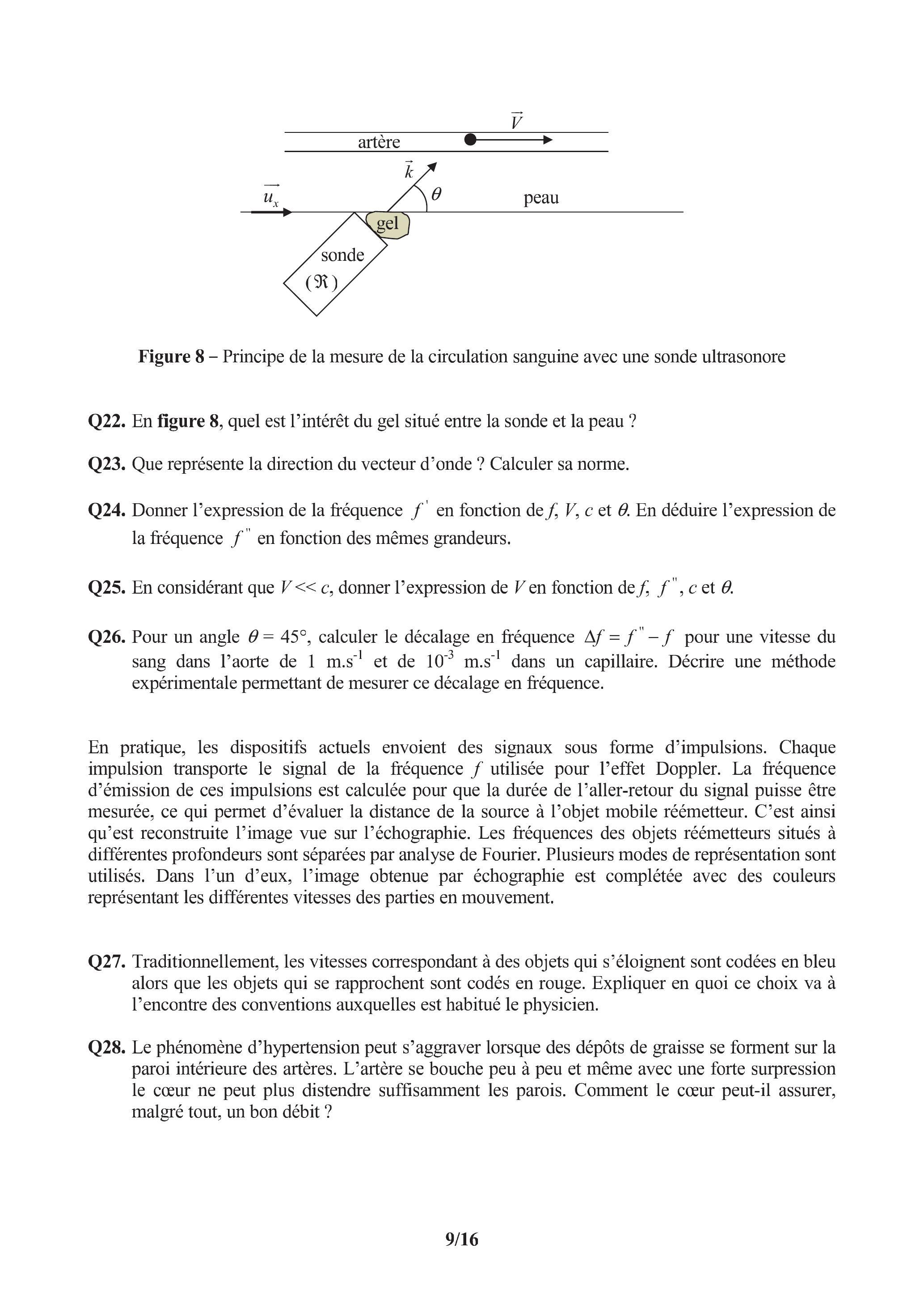 Q26. Pour un angle , calculer le décalage en fréquence pour une vitesse du sang dans l'aorte de et de dans un capillaire. Décrire une méthode expérimentale permettant de mesurer ce décalage en fréquence.