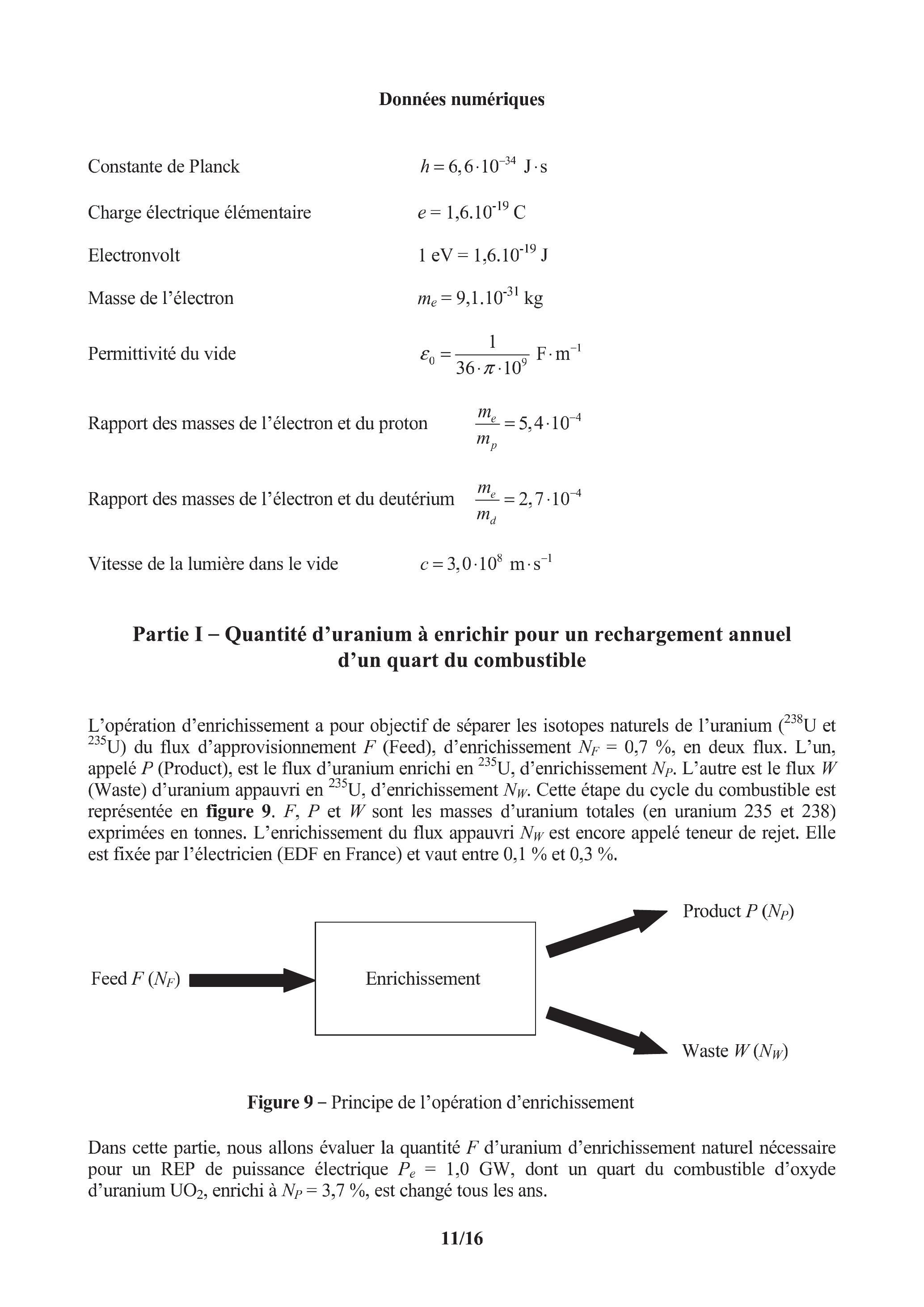 Dans cette partie, nous allons évaluer la quantité d'uranium d'enrichissement naturel nécessaire pour un REP de puissance électrique , dont un quart du combustible d'oxyde d'uranium , enrichi à , est changé tous les ans.