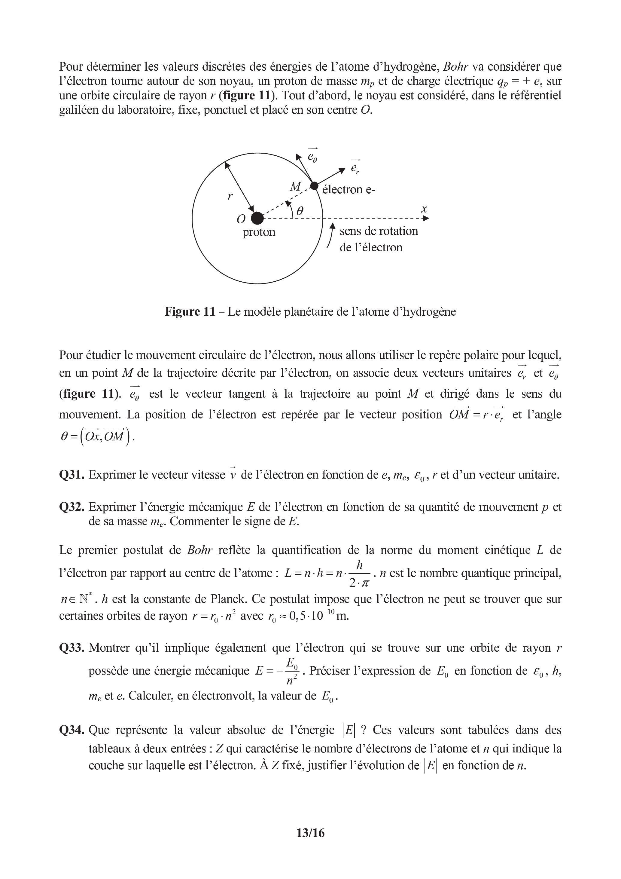 Q33. Montrer qu'il implique également que l'électron qui se trouve sur une orbite de rayon possède une énergie mécanique . Préciser l'expression de en fonction de , et . Calculer, en électronvolt, la valeur de .