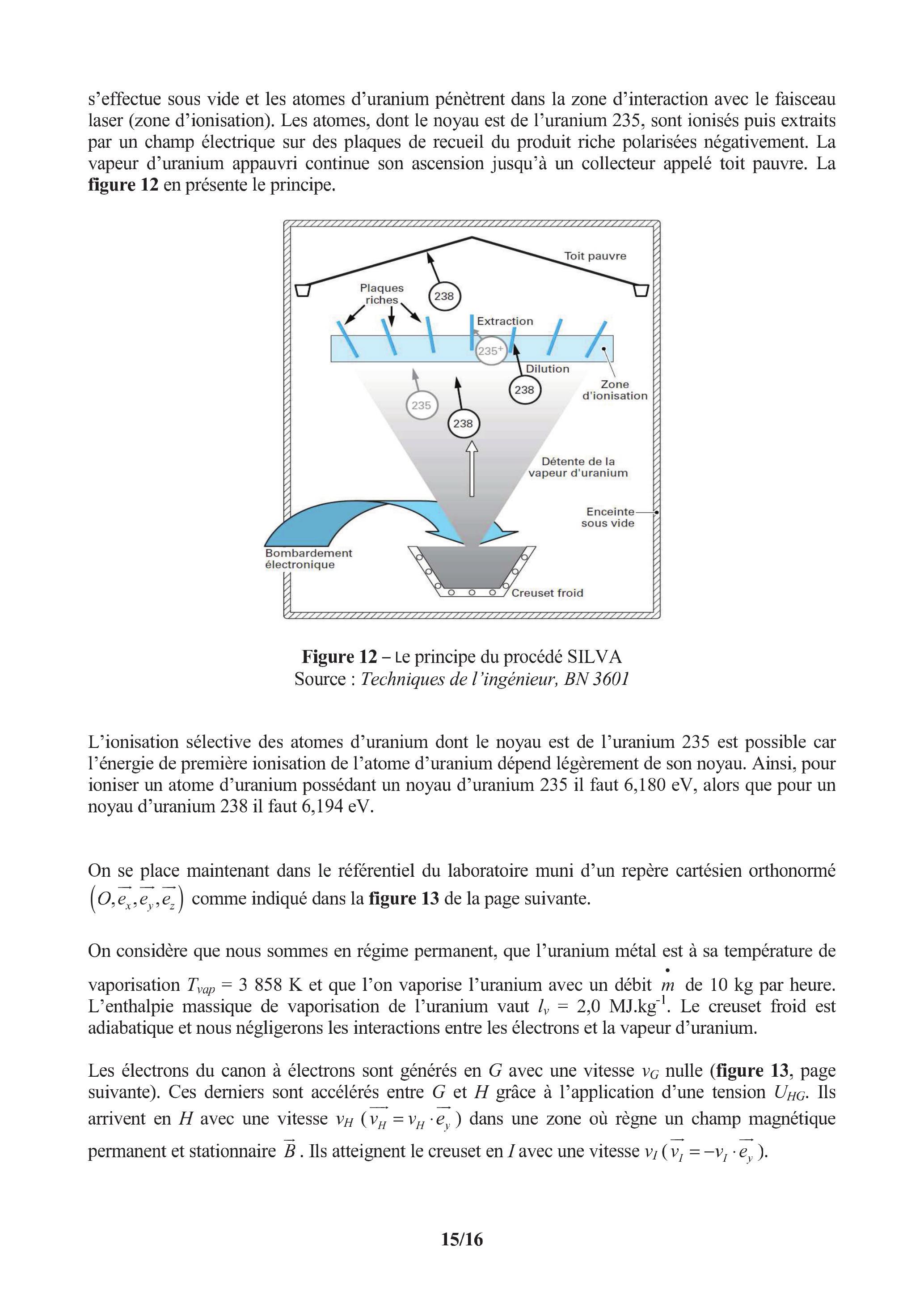 Ce problème a pour objectif d'étudier le principe d'un des procédés d'enrichissement envisagé par le commissariat à l'énergie atomique et aux énergies alternatives (CEA) : le procédé par Séparation Isotopique par Laser sur Vapeur Atomique (SILVA). Il est basé sur l'ionisation des atomes contenant des noyaux d'uranium 235 à travers la mise en œuvre de lasers.