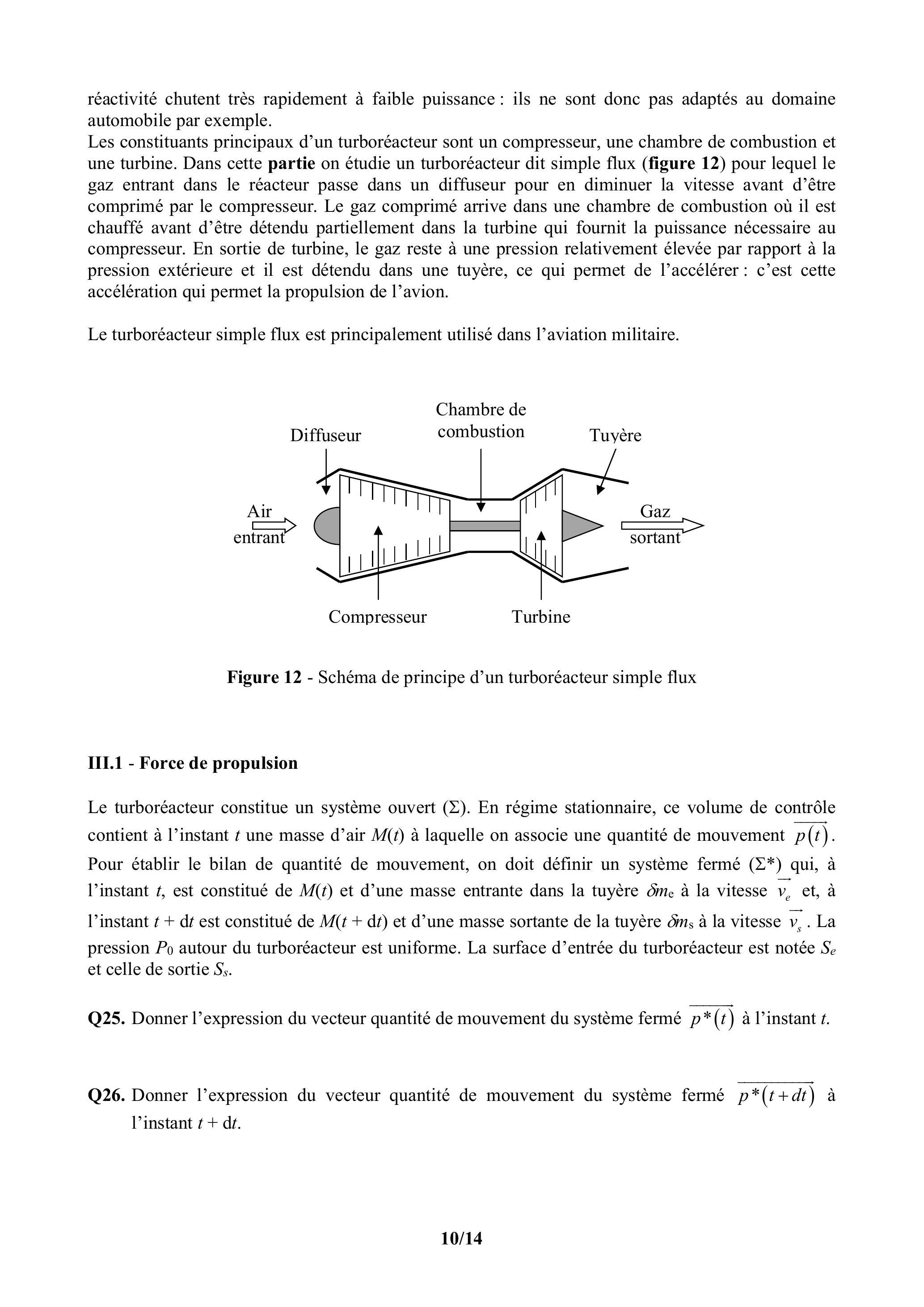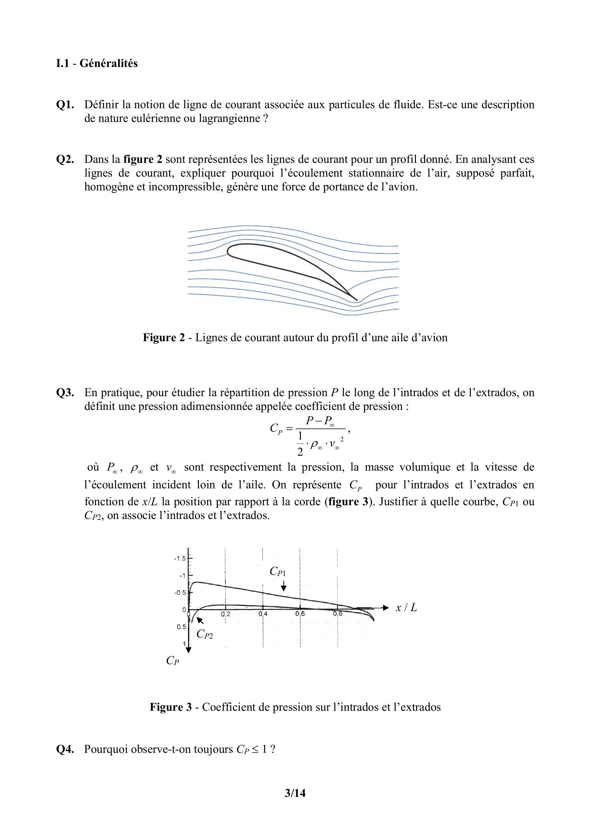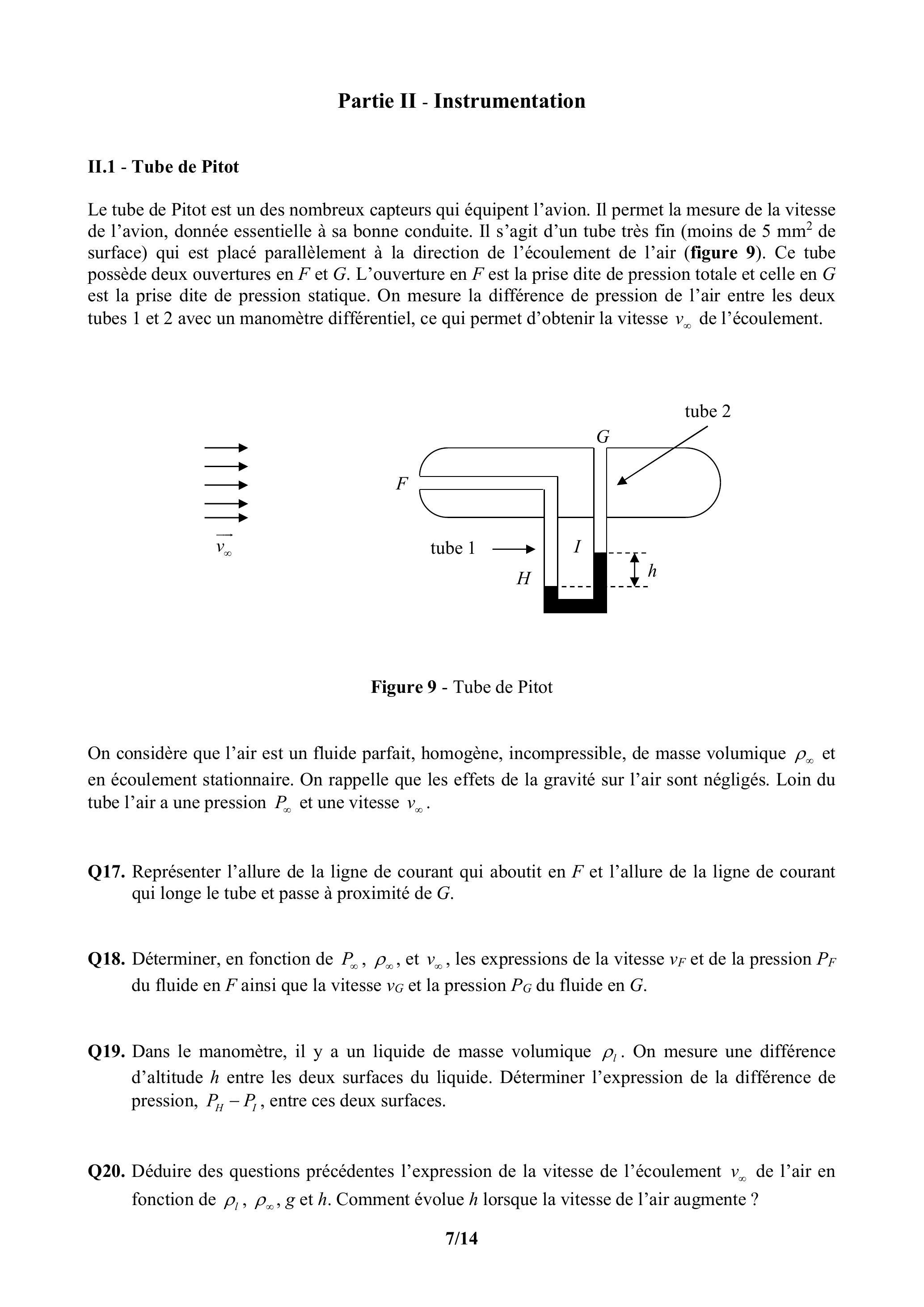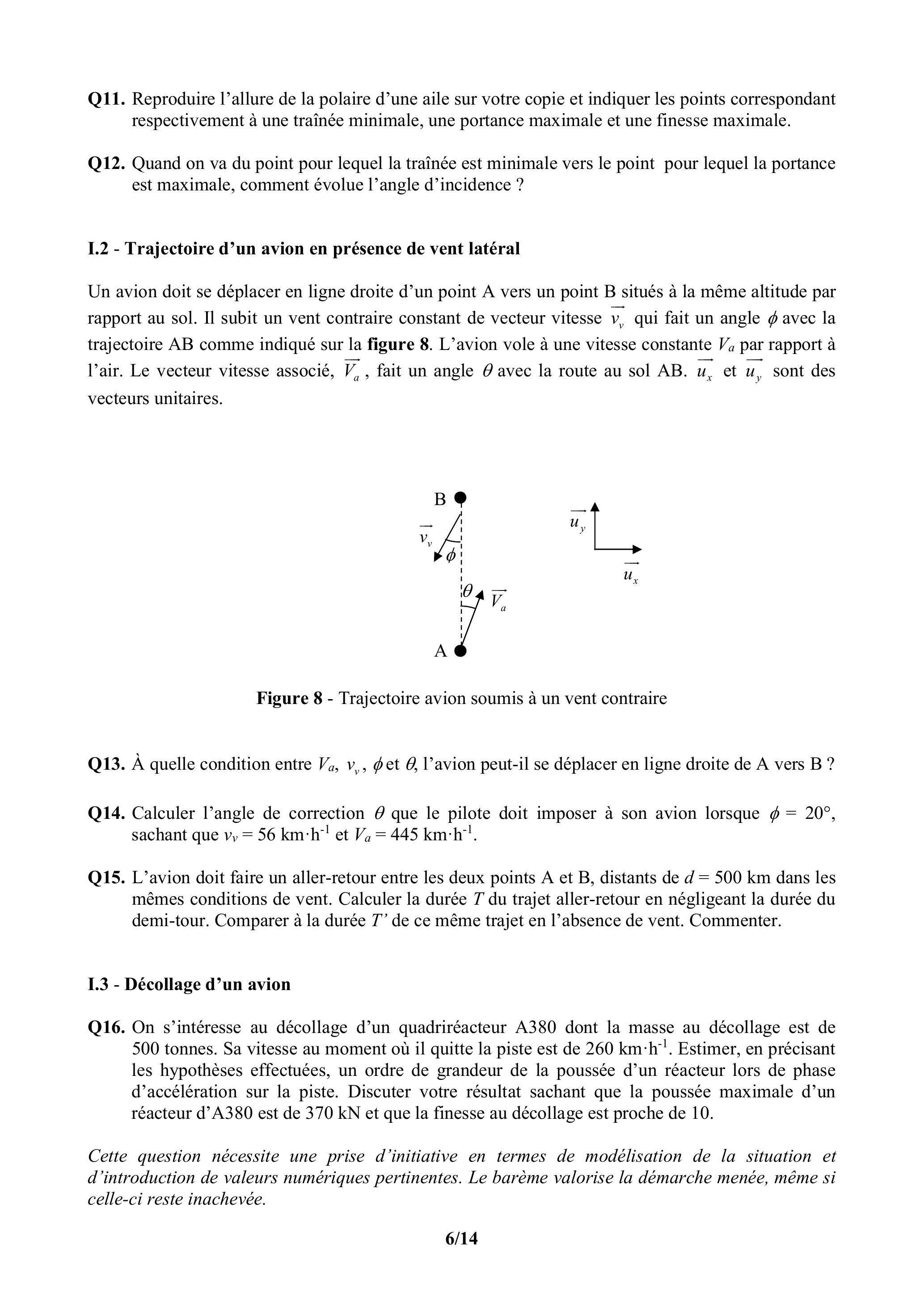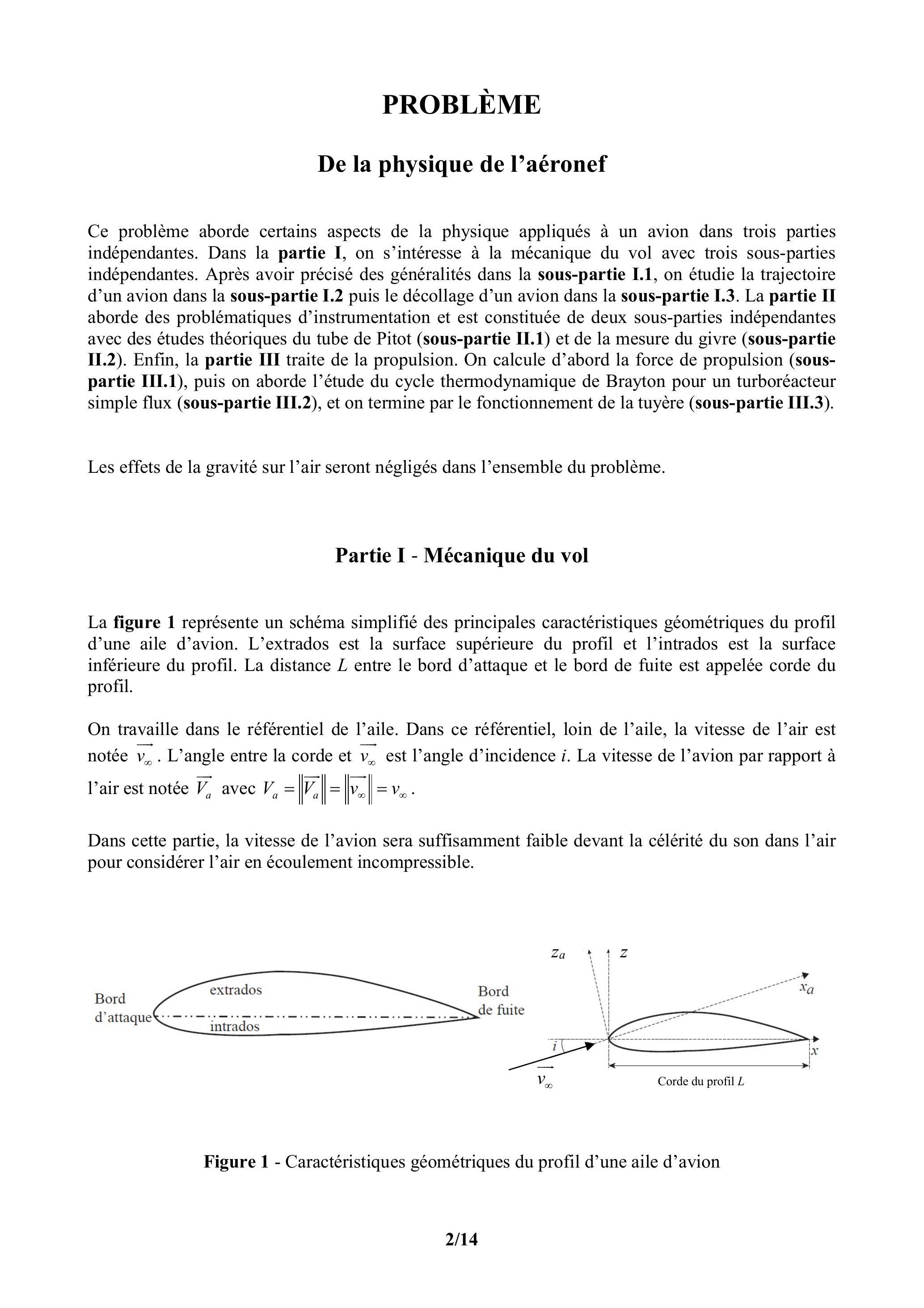 Ce problème aborde certains aspects de la physique appliqués à un avion dans trois parties indépendantes. Dans la partie I, on s'intéresse à la mécanique du vol avec trois sous-parties indépendantes. Après avoir précisé des généralités dans la sous-partie I.1, on étudie la trajectoire d'un avion dans la sous-partie I. 2 puis le décollage d'un avion dans la sous-partie I.3. La partie II aborde des problématiques d'instrumentation et est constituée de deux sous-parties indépendantes avec des études théoriques du tube de Pitot (sous-partie II.1) et de la mesure du givre (sous-partie II.2). Enfin, la partie III traite de la propulsion. On calcule d'abord la force de propulsion (souspartie III.1), puis on aborde l'étude du cycle thermodynamique de Brayton pour un turboréacteur simple flux (sous-partie III.2), et on termine par le fonctionnement de la tuyère (sous-partie III.3).