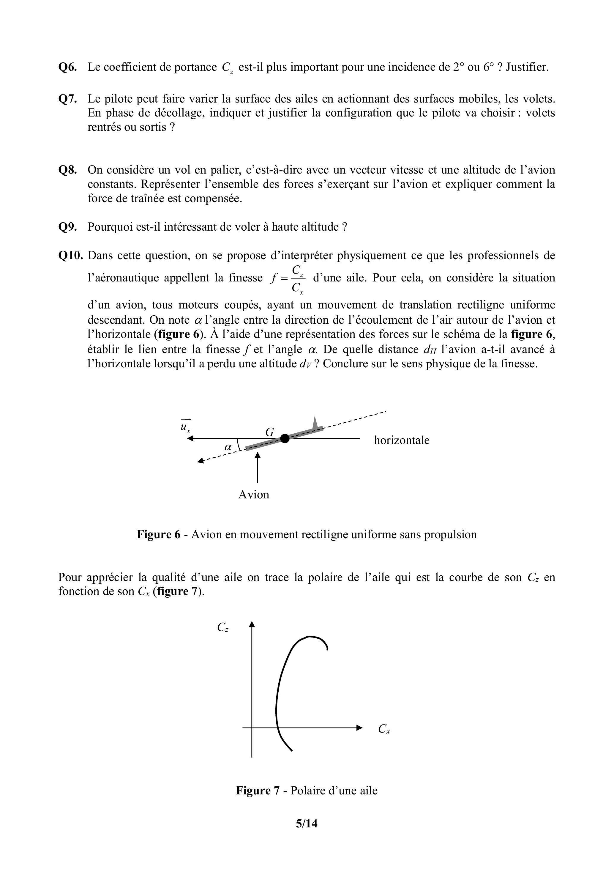 Q10. Dans cette question, on se propose d'interpréter physiquement ce que les professionnels de l'aéronautique appellent la finesse d'une aile. Pour cela, on considère la situation d'un avion, tous moteurs coupés, ayant un mouvement de translation rectiligne uniforme descendant. On note l'angle entre la direction de l'écoulement de l'air autour de l'avion et l'horizontale (figure 6). À l'aide d'une représentation des forces sur le schéma de la figure 6, établir le lien entre la finesse et l'angle . De quelle distance l'avion a-t-il avancé à l'horizontale lorsqu'il a perdu une altitude ? Conclure sur le sens physique de la finesse.