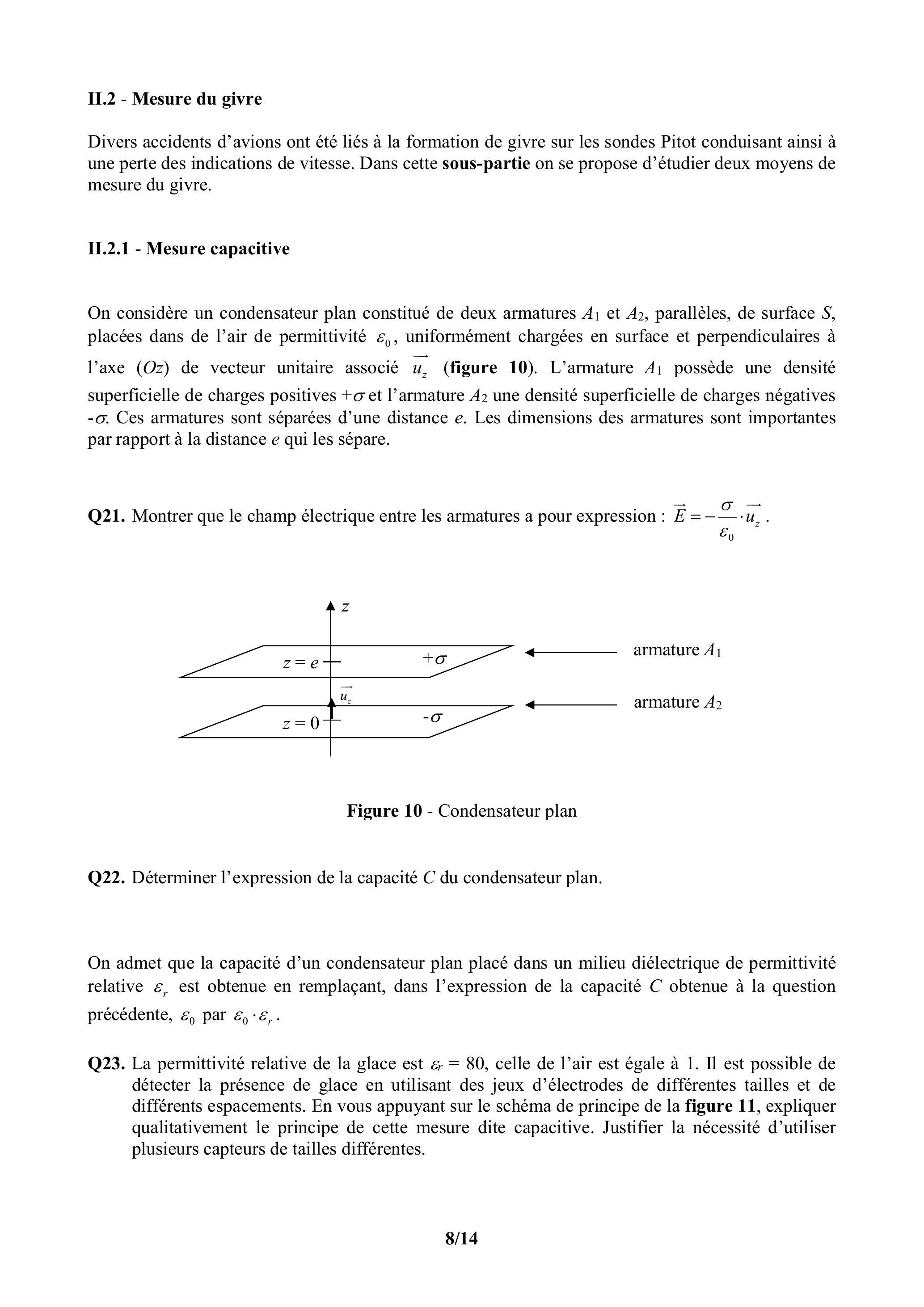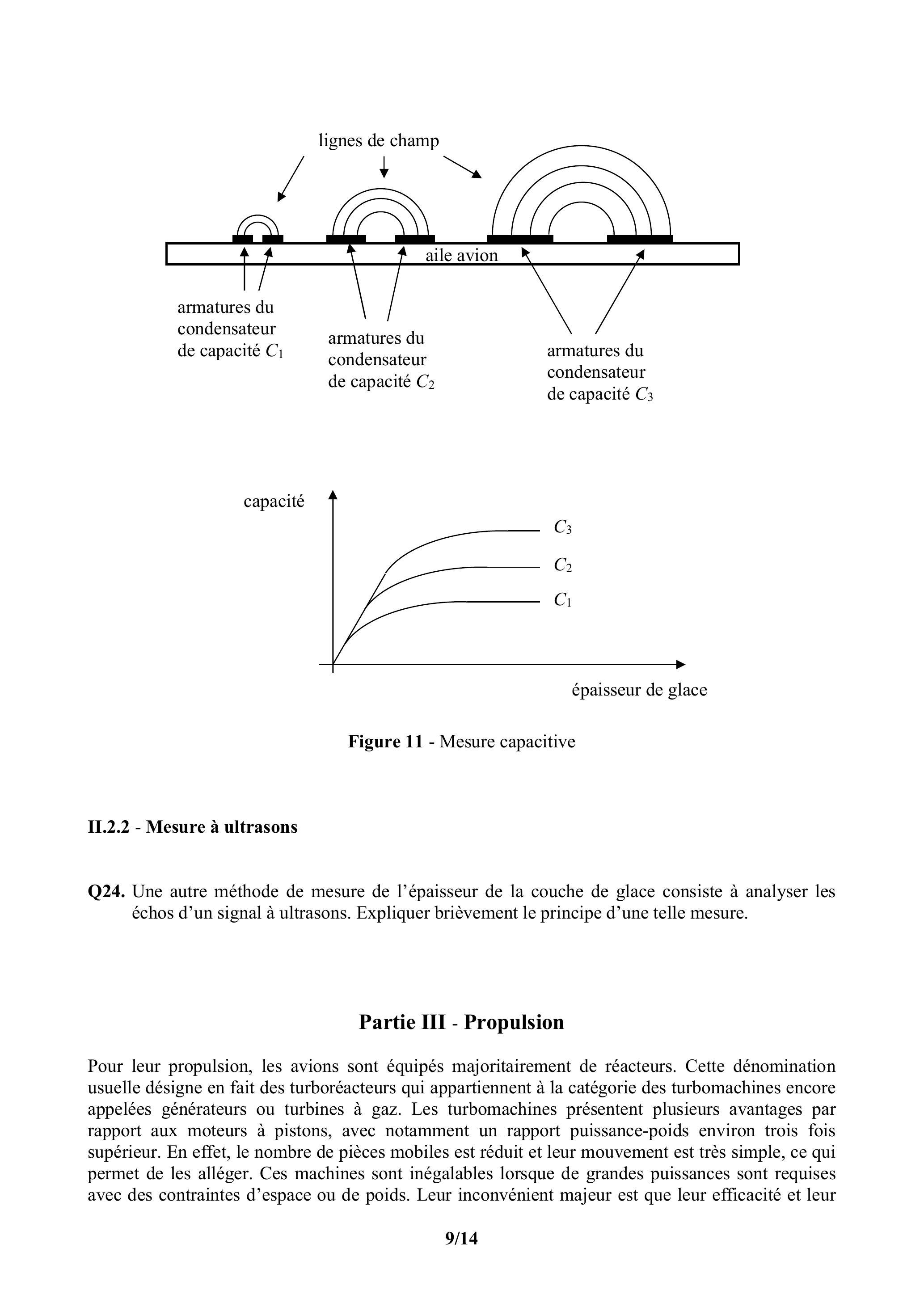 Q23. La permittivité relative de la glace est , celle de l'air est égale à 1 . Il est possible de détecter la présence de glace en utilisant des jeux d'électrodes de différentes tailles et de différents espacements. En vous appuyant sur le schéma de principe de la figure 11, expliquer qualitativement le principe de cette mesure dite capacitive. Justifier la nécessité d'utiliser plusieurs capteurs de tailles différentes.