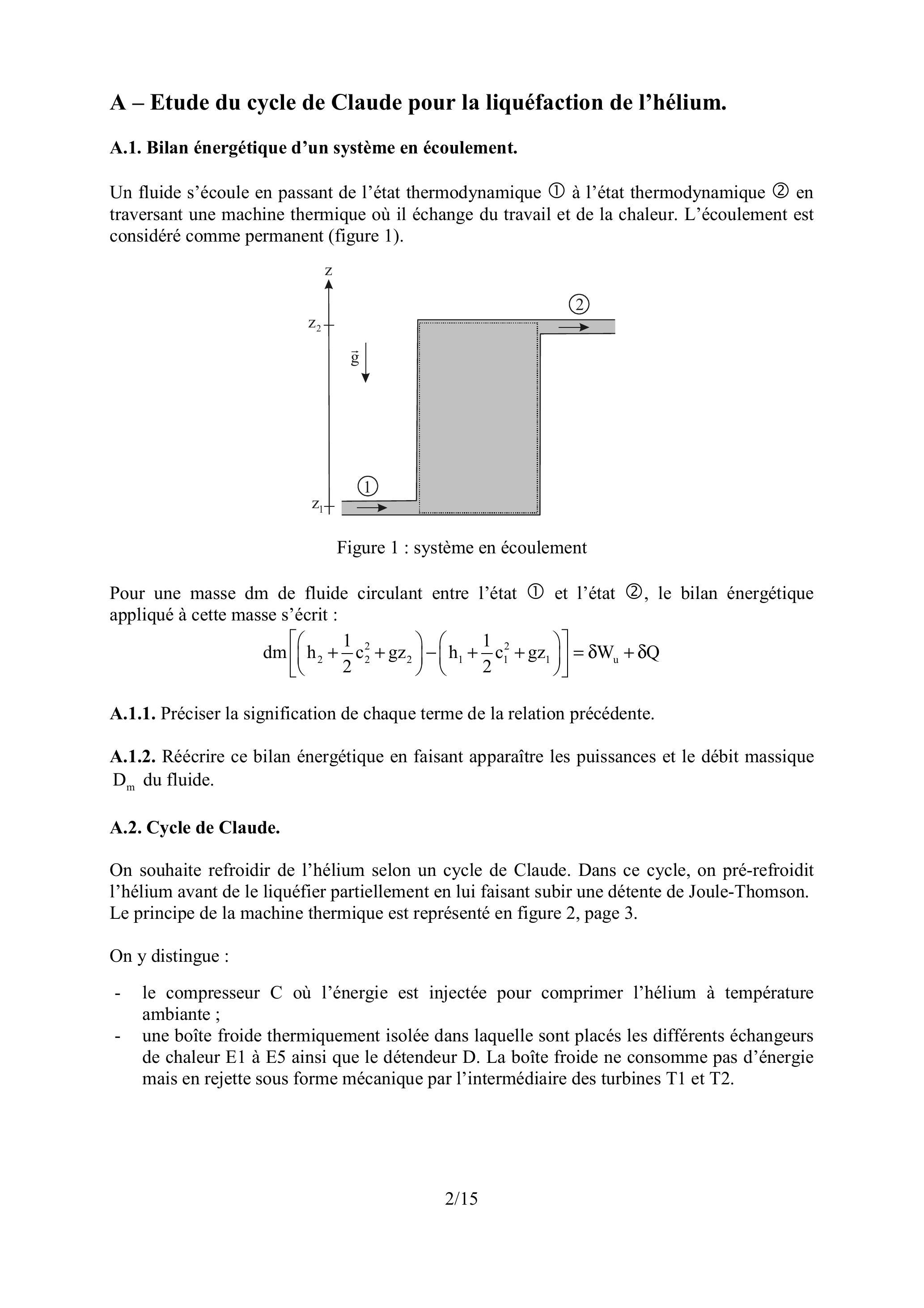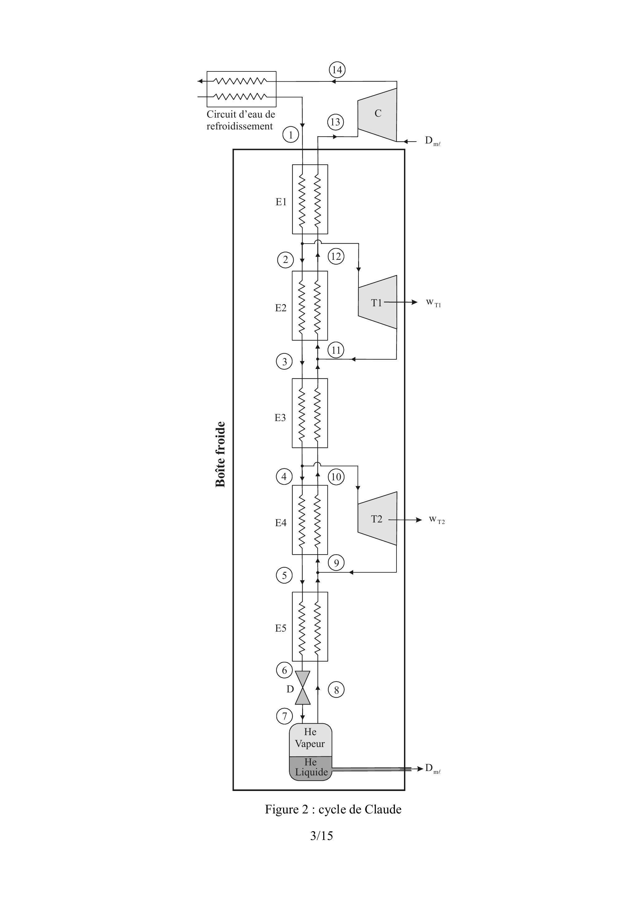 On souhaite refroidir de l'hélium selon un cycle de Claude. Dans ce cycle, on pré-refroidit l'hélium avant de le liquéfier partiellement en lui faisant subir une détente de Joule-Thomson. Le principe de la machine thermique est représenté en figure 2, page 3.