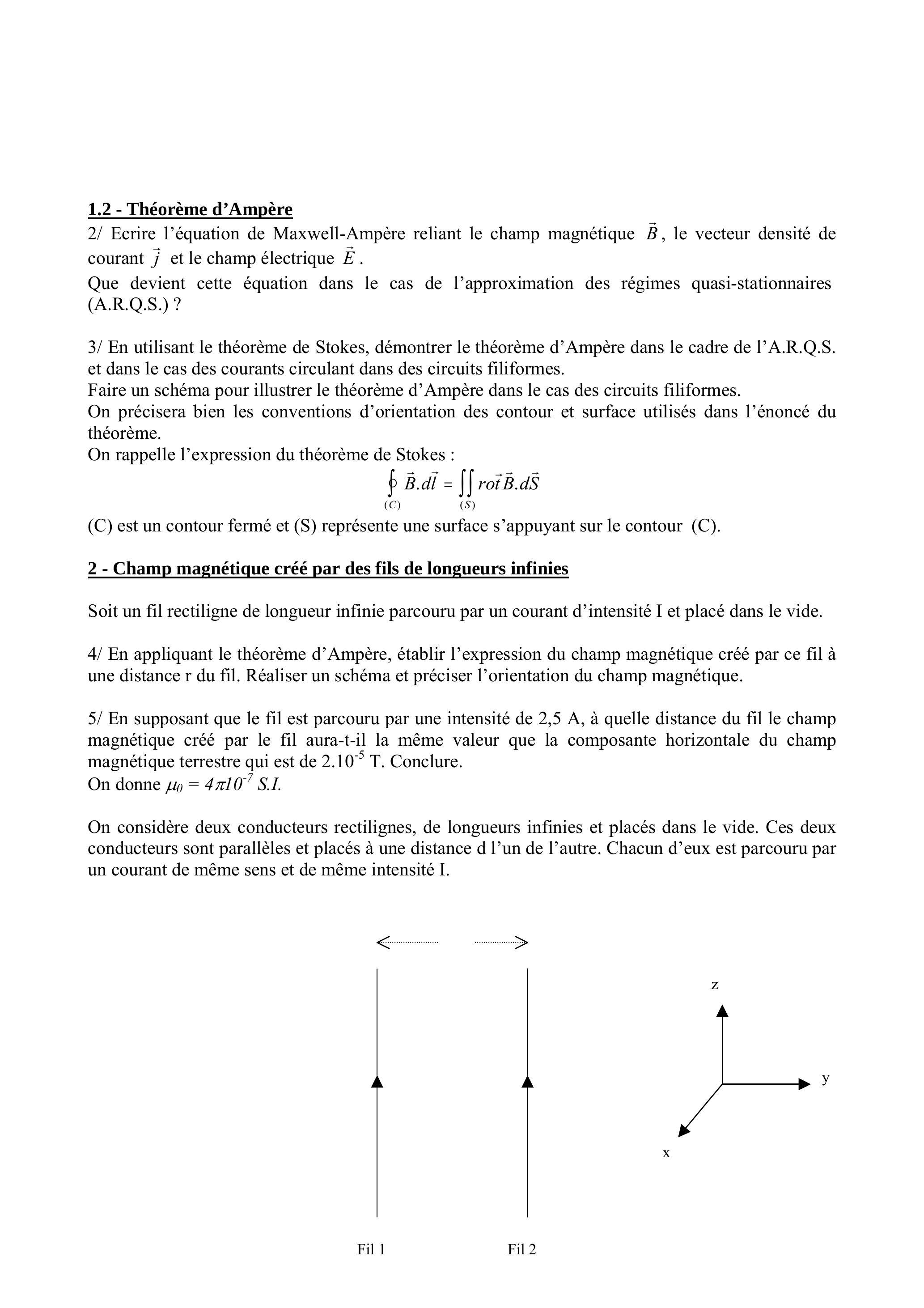 3/ En utilisant le théorème de Stokes, démontrer le théorème d'Ampère dans le cadre de l'A.R.Q.S. et dans le cas des courants circulant dans des circuits filiformes.
