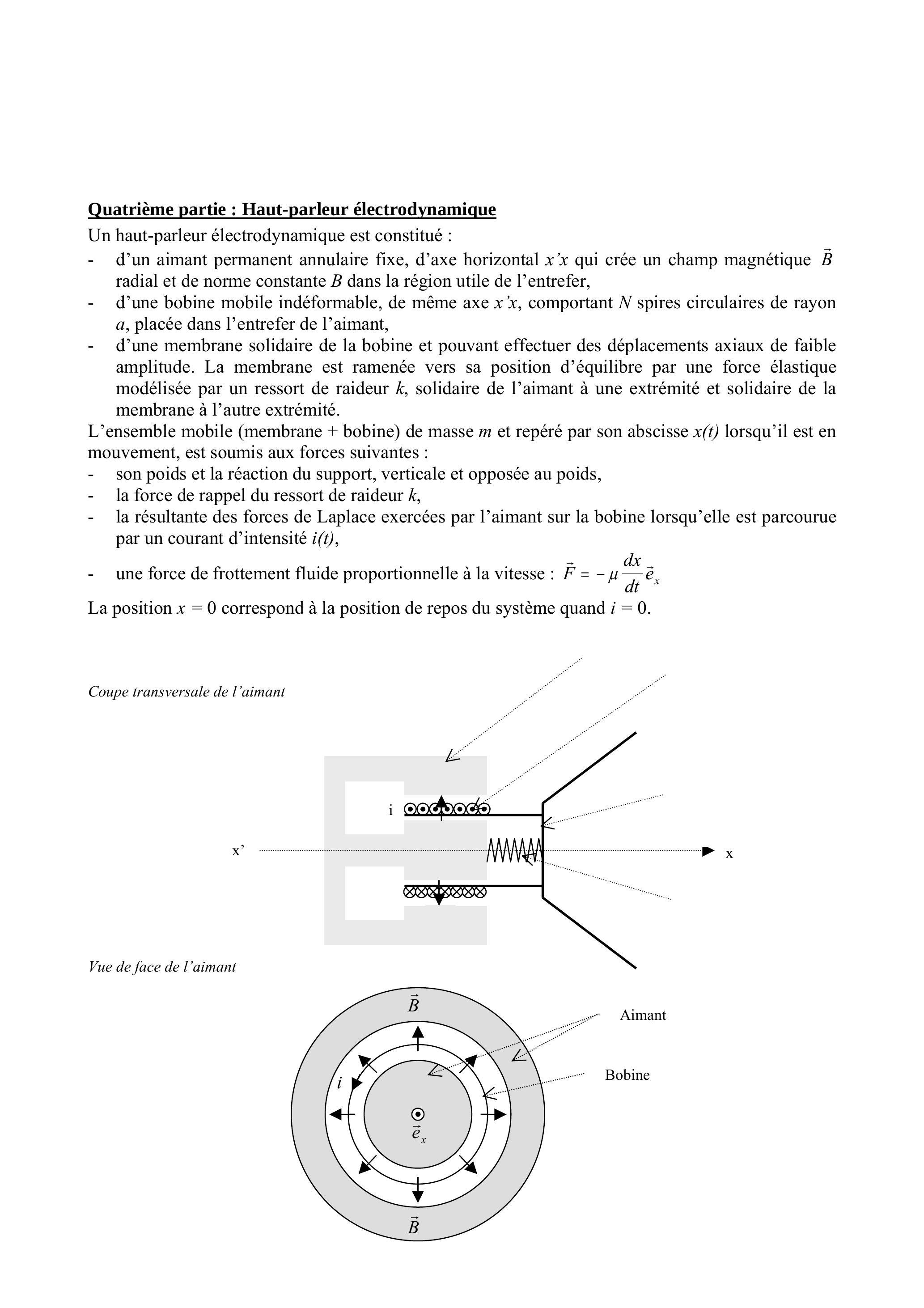 L'ensemble mobile (membrane + bobine) de masse et repéré par son abscisse lorsqu'il est en mouvement, est soumis aux forces suivantes :