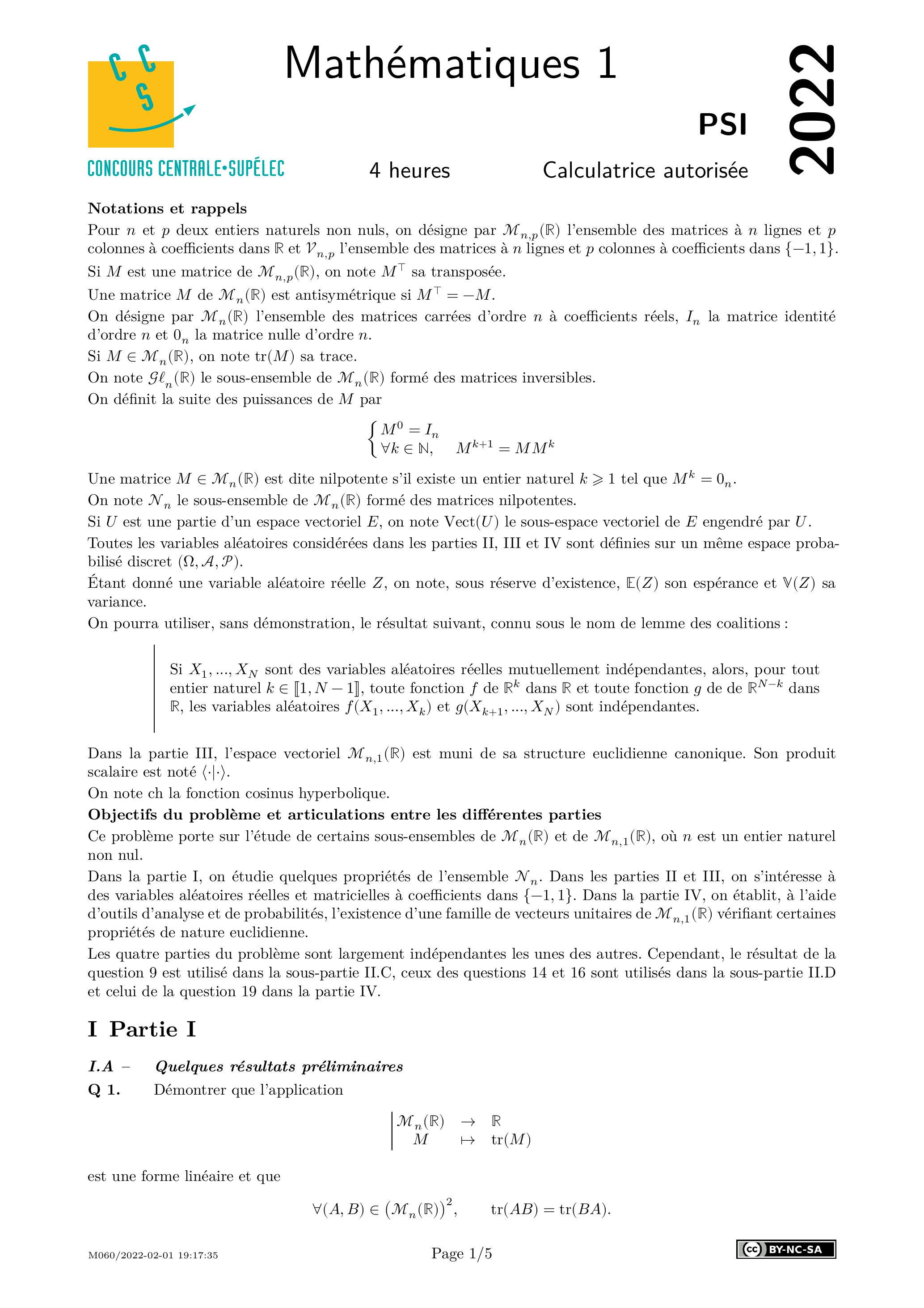 Centrale Mathématiques 1 PSI 2022 - Version Web LaTeX | WikiPrépa | WikiPrépa
