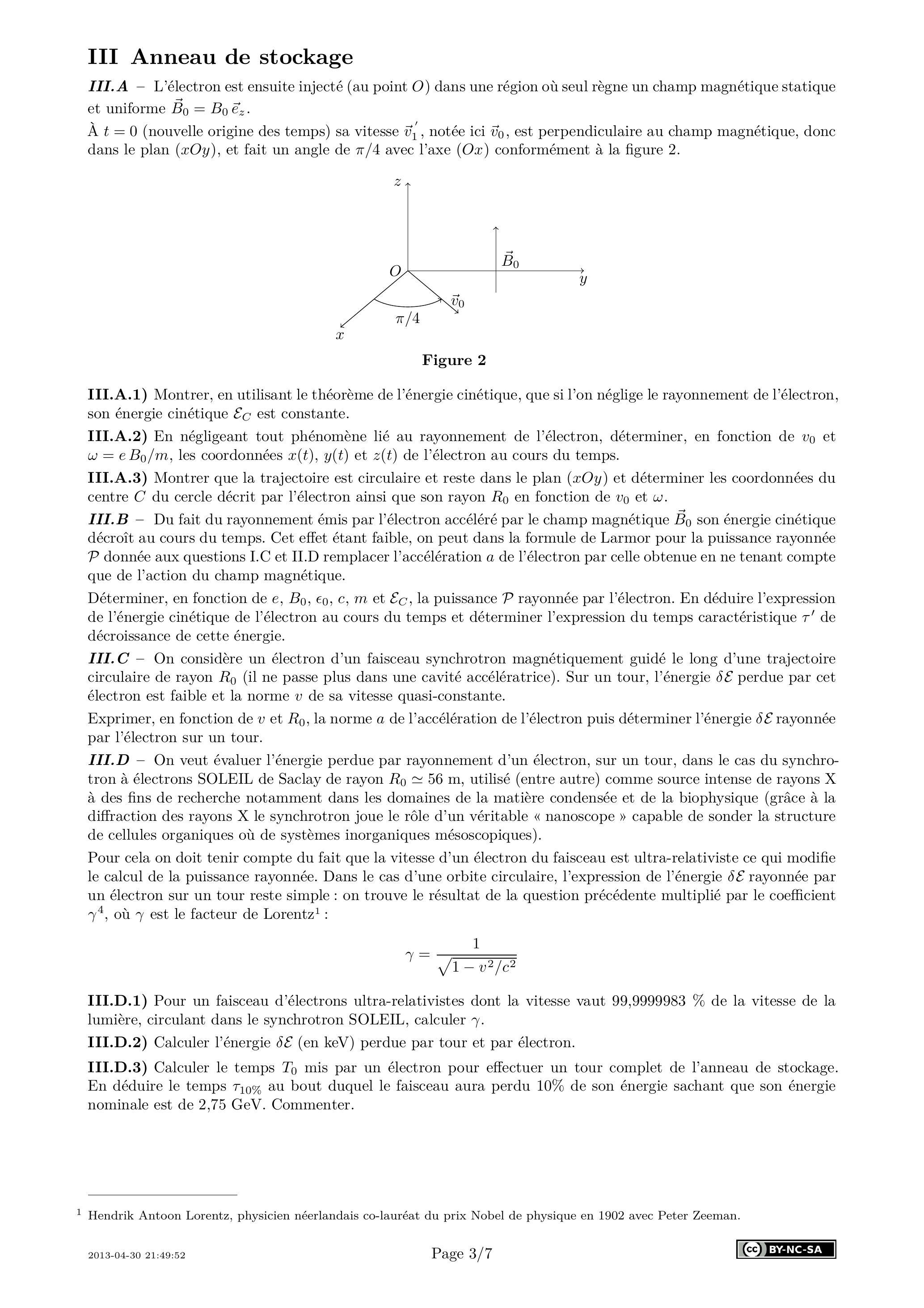 III.D - On veut évaluer l'énergie perdue par rayonnement d'un électron, sur un tour, dans le cas du synchrotron à électrons SOLEIL de Saclay de rayon , utilisé (entre autre) comme source intense de rayons X à des fins de recherche notamment dans les domaines de la matière condensée et de la biophysique (grâce à la diffraction des rayons le synchrotron joue le rôle d'un véritable «nanoscope» capable de sonder la structure de cellules organiques où de systèmes inorganiques mésoscopiques).