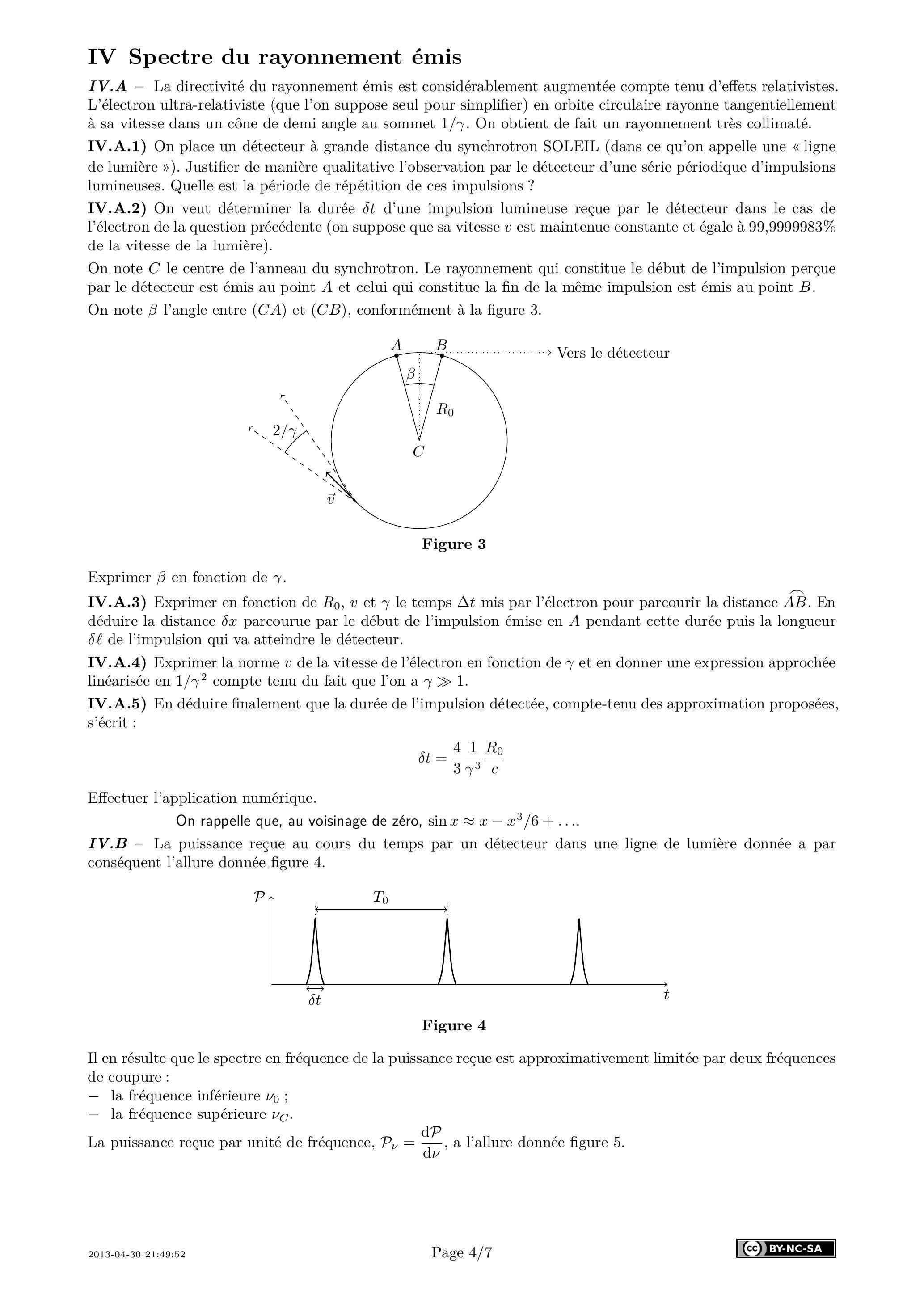 Ce problème a pour but d'étudier le rayonnement émis par des particules élémentaires chargées dans un accélérateur synchrotron. La première partie propose de déterminer l'expression de la puissance rayonnée (formule de Larmor) en admettant l'expression du champ (magnétique) rayonné. La deuxième partie étudie une méthode d'accélération des particules, avant leur injection dans l'anneau de stockage, ainsi que l'influence du rayonnement sur cette accélération. Les troisième et quatrième parties étudient à proprement parler le rayonnement synchrotron émis par les particules dans l'anneau de stockage le long duquel elles sont guidées par un champ magnétique. Enfin, la cinquième partie s'intéresse à un élément d'insertion courant sur les synchrotrons de génération récente appelé onduleur et destiné à obtenir un rayonnement plus intense et plus concentré en fréquence.
