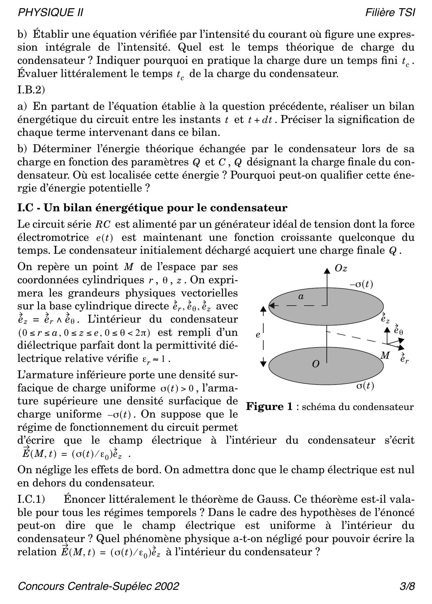 Ce premier problème fait l'étude de bilans énergétiques de composants électriques tels un conducteur ohmique de résistance ou un condensateur parfait de capacité . La section I.A est indépendante des sections I.B et I.C. Les sections I.B et I.C sont dans une très large mesure indépendantes.