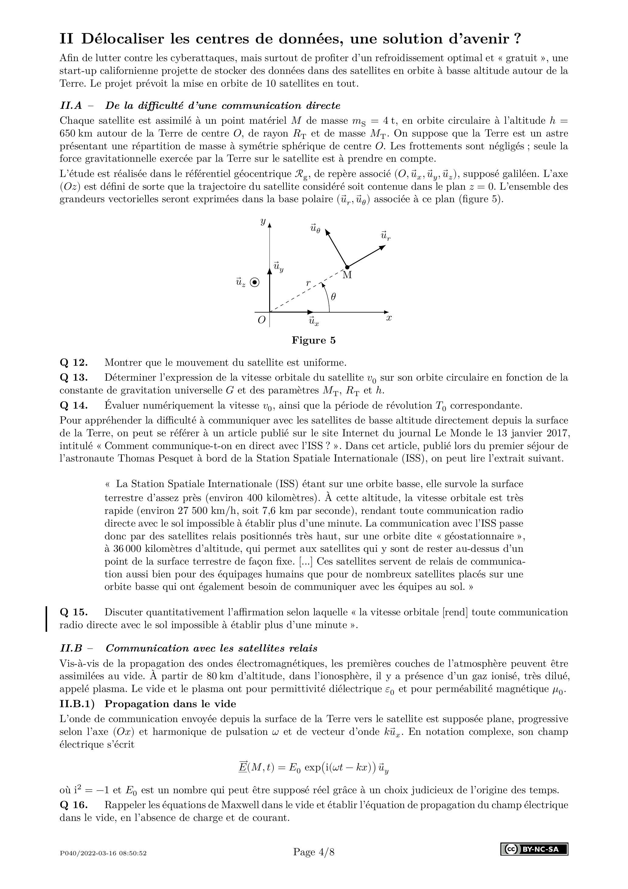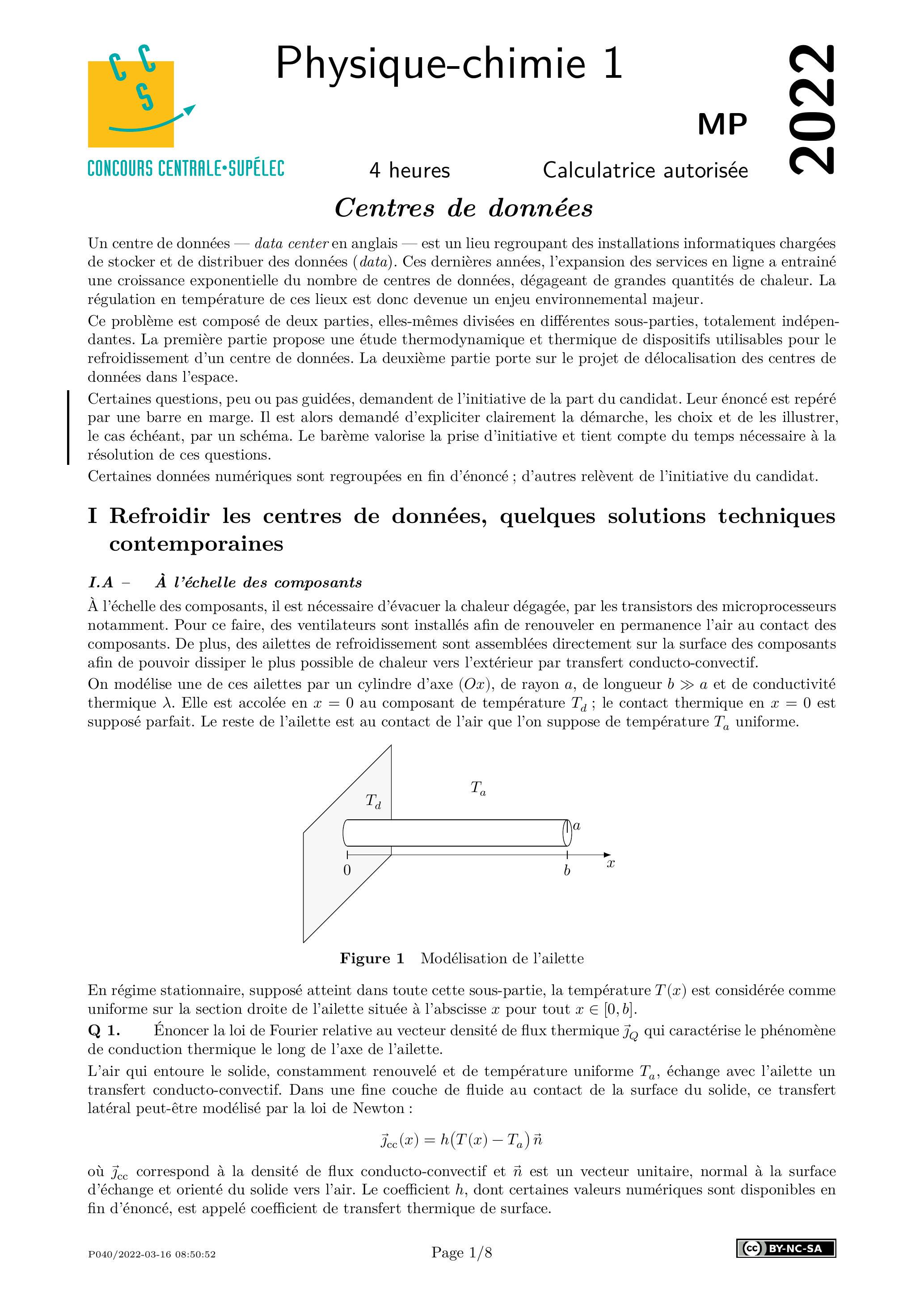 Ce problème est composé de deux parties, elles-mêmes divisées en différentes sous-parties, totalement indépendantes. La première partie propose une étude thermodynamique et thermique de dispositifs utilisables pour le refroidissement d'un centre de données. La deuxième partie porte sur le projet de délocalisation des centres de données dans l'espace.