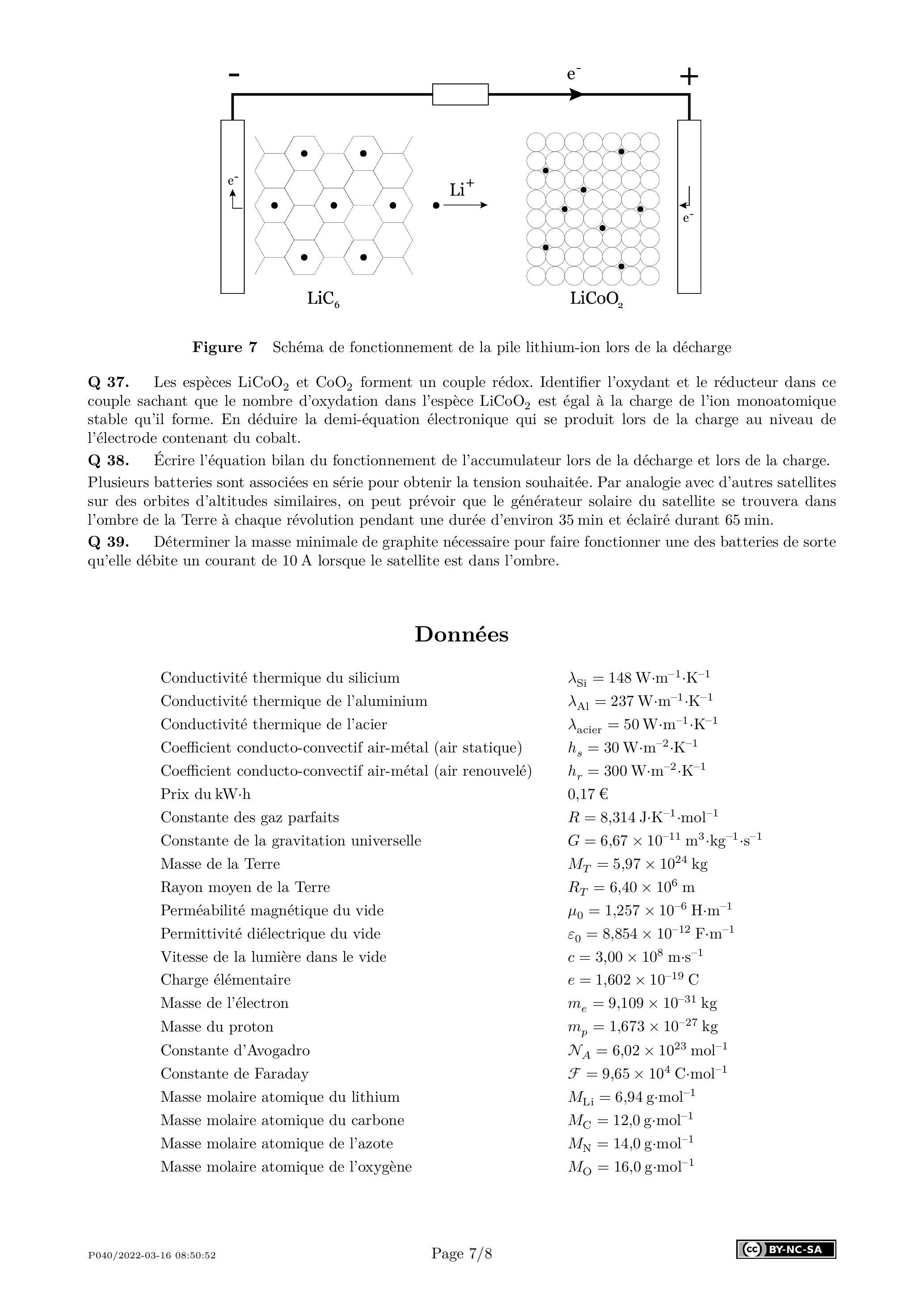 Q 39. Déterminer la masse minimale de graphite nécessaire pour faire fonctionner une des batteries de sorte qu'elle débite un courant de 10 A lorsque le satellite est dans l'ombre.