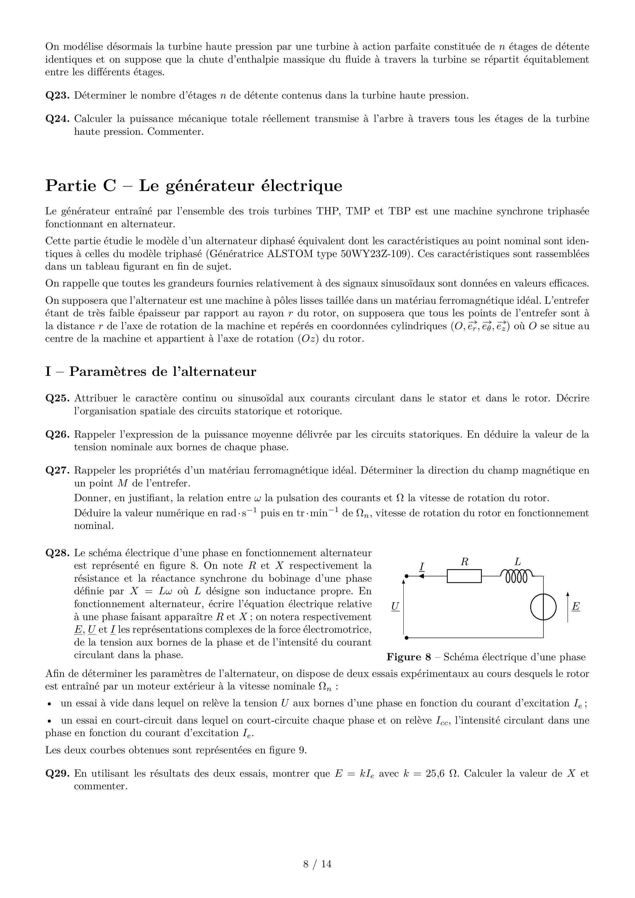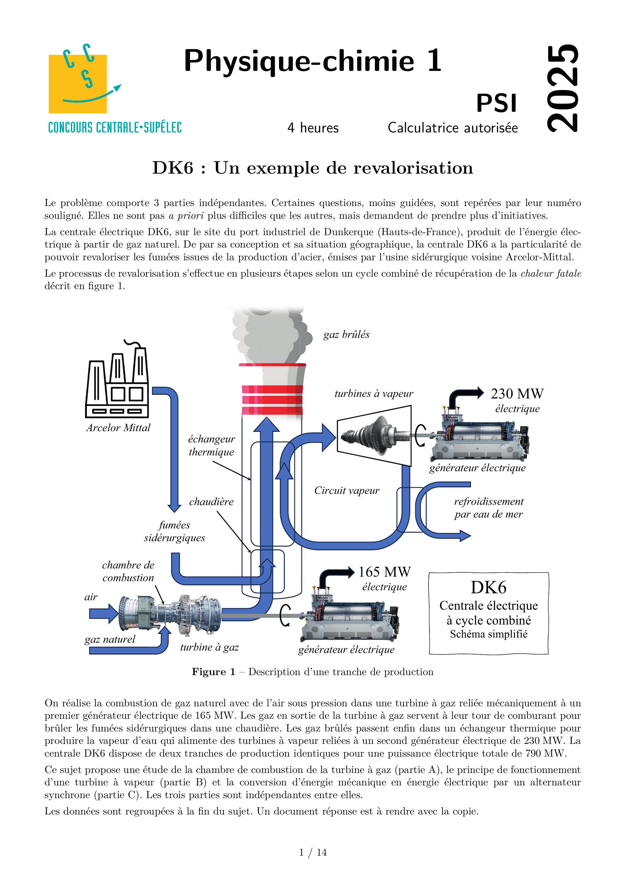 Ce sujet propose une étude de la chambre de combustion de la turbine à gaz (partie A), le principe de fonctionnement d'une turbine à vapeur (partie B) et la conversion d'énergie mécanique en énergie électrique par un alternateur synchrone (partie C). Les trois parties sont indépendantes entre elles.
