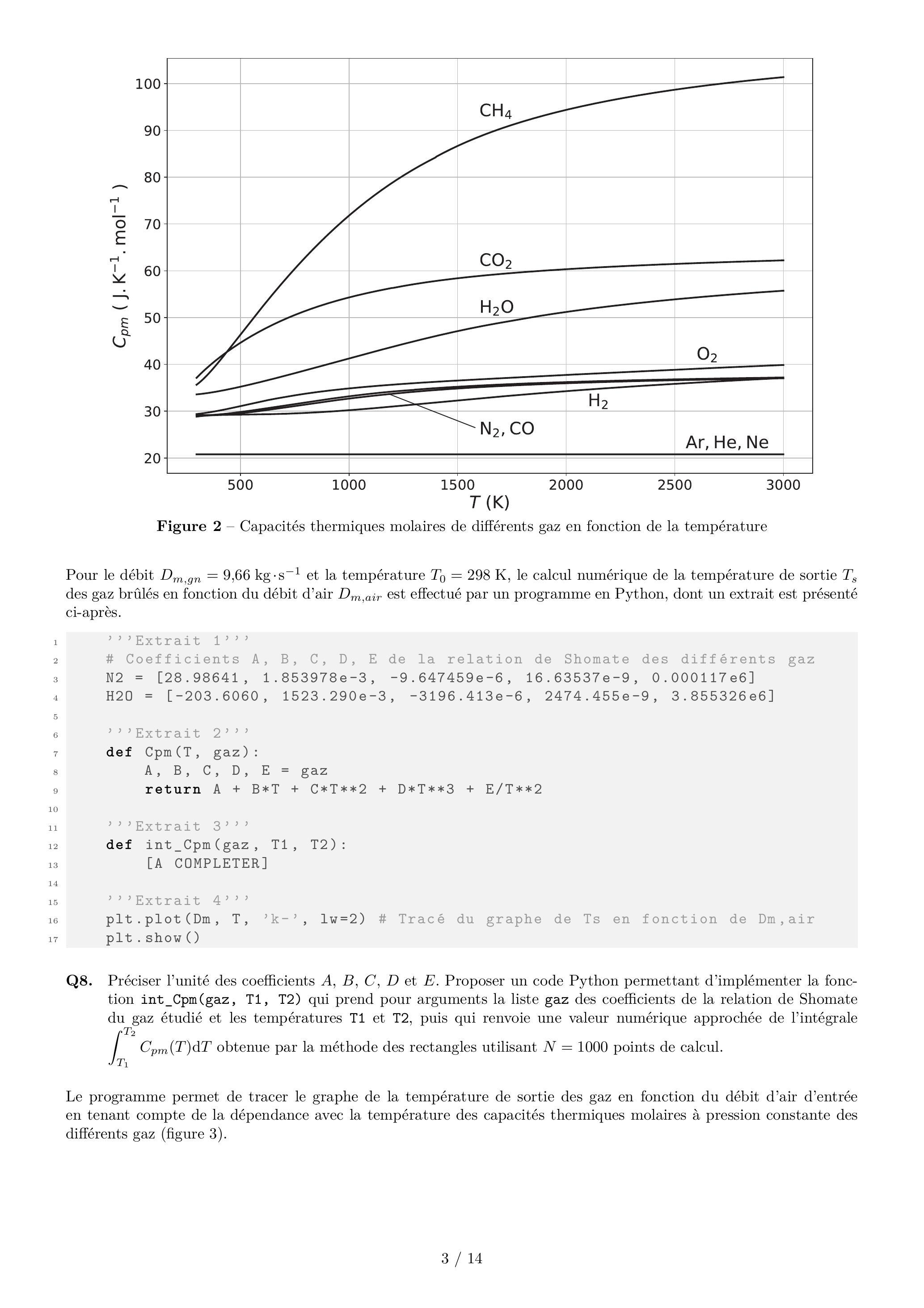 Q7. Reprendre la question Q6 pour établir, dans le cas où , la nouvelle relation donnant le débit massique d'air en fonction de la température de sortie des gaz en tenant compte de l'influence de la température sur les capacités thermiques molaires à pression constante, sous forme intégrale que l'on ne cherchera pas à calculer.