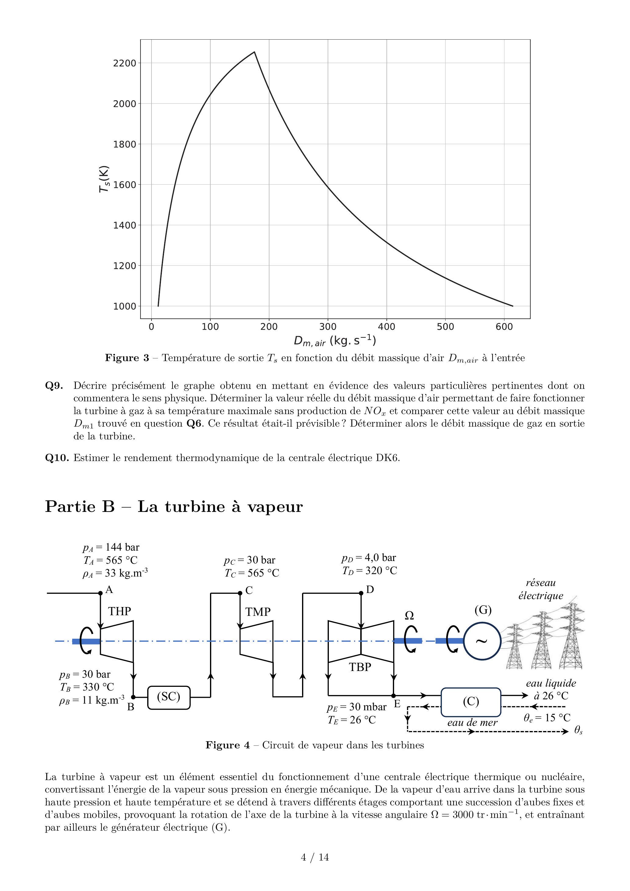 La centrale électrique DK6 utilise un circuit de vapeur sèche traversant successivement une turbine haute pression (THP), un surchauffeur (SC), une turbine moyenne pression (TMP) et une turbine basse pression (TBP). Les turbines sont supposées parfaitement calorifugées et alignées sur le même axe de rotation. Pour éviter tout phénomène de corrosion, il ne doit jamais exister de liquide dans les turbines. En sortie de la turbine basse pression, le fluide, alors sous forme de vapeur juste saturante, traverse de façon isobare un condenseur (C) à circulation d'eau de mer. Le schéma de la figure 4 présente quelques caractéristiques de la vapeur aux différents points notés et du circuit. Le débit massique de vapeur dans le circuit doit être contrôlé et vaut .