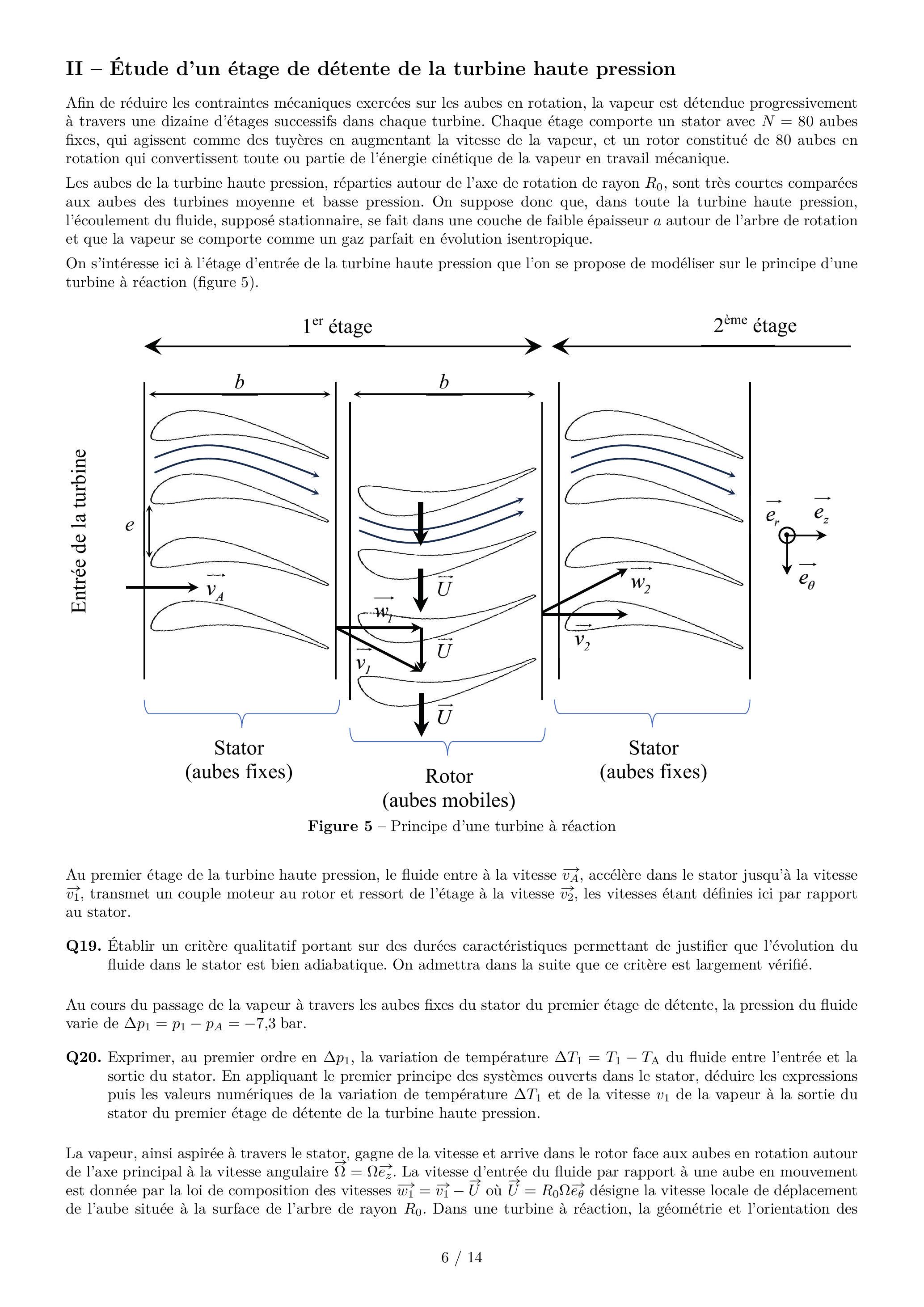 Q20. Exprimer, au premier ordre en , la variation de température du fluide entre l'entrée et la sortie du stator. En appliquant le premier principe des systèmes ouverts dans le stator, déduire les expressions puis les valeurs numériques de la variation de température et de la vitesse de la vapeur à la sortie du stator du premier étage de détente de la turbine haute pression.