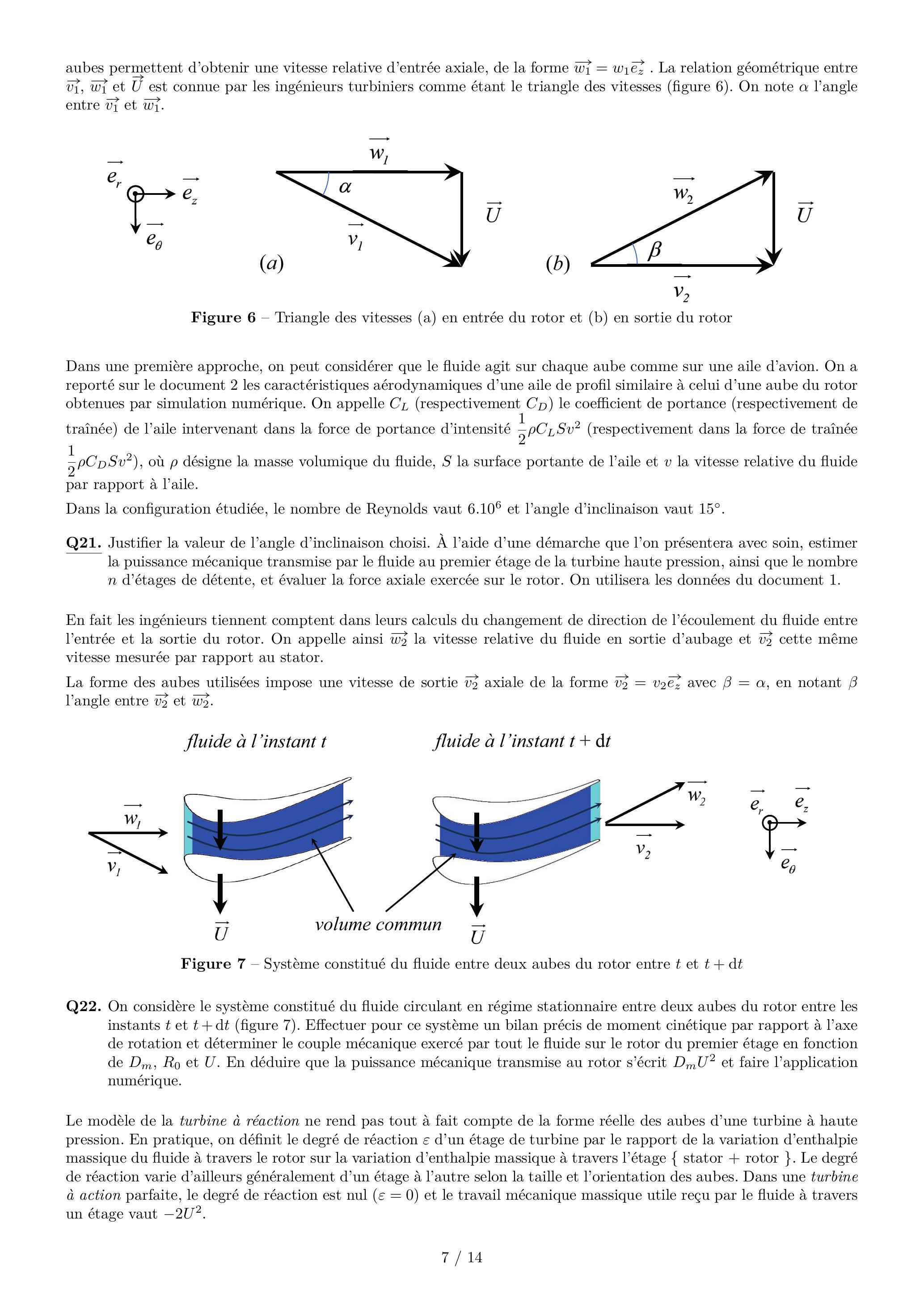 Q21. Justifier la valeur de l'angle d'inclinaison choisi. À l'aide d'une démarche que l'on présentera avec soin, estimer la puissance mécanique transmise par le fluide au premier étage de la turbine haute pression, ainsi que le nombre d'étages de détente, et évaluer la force axiale exercée sur le rotor. On utilisera les données du document 1 .