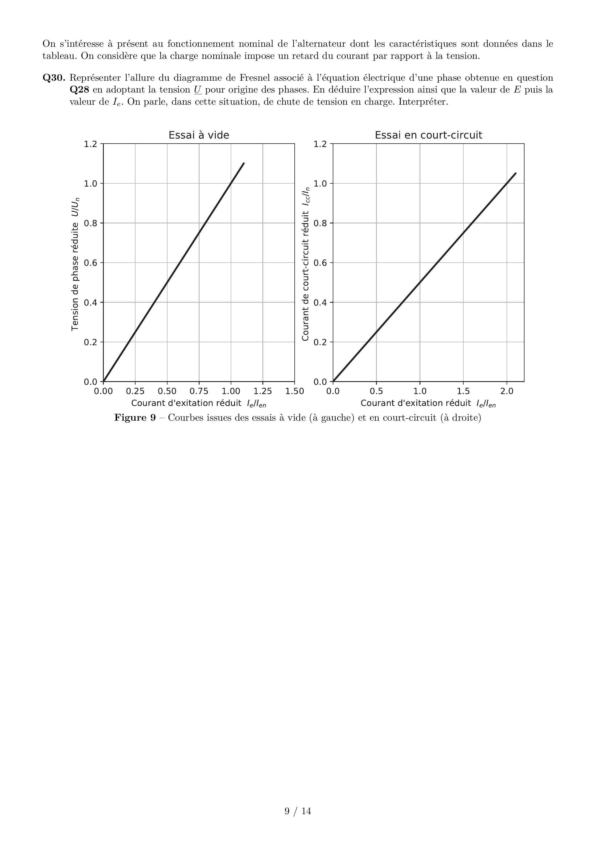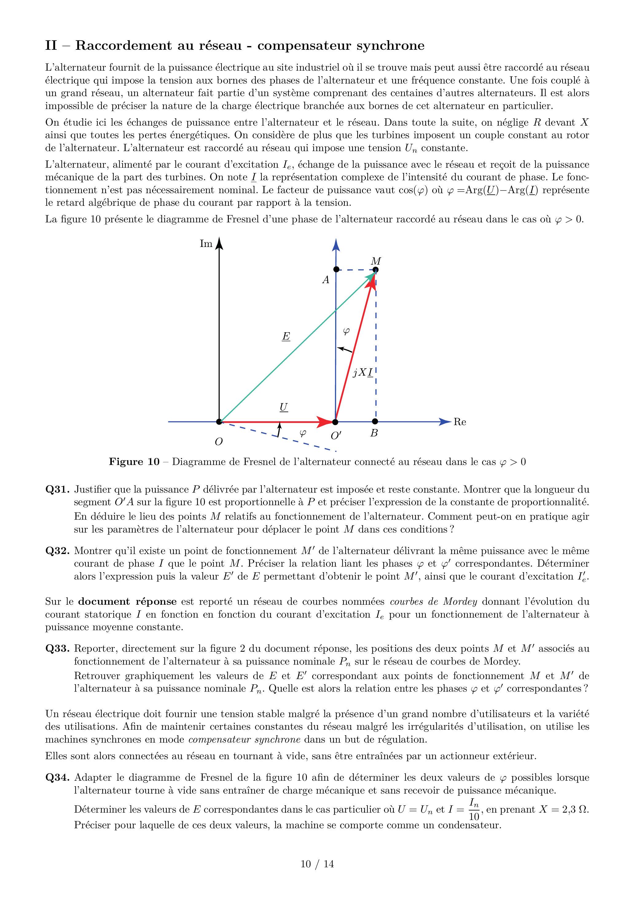 Q33. Reporter, directement sur la figure 2 du document réponse, les positions des deux points et associés au fonctionnement de l'alternateur à sa puissance nominale sur le réseau de courbes de Mordey. Retrouver graphiquement les valeurs de et correspondant aux points de fonctionnement et de l'alternateur à sa puissance nominale . Quelle est alors la relation entre les phases et correspondantes?