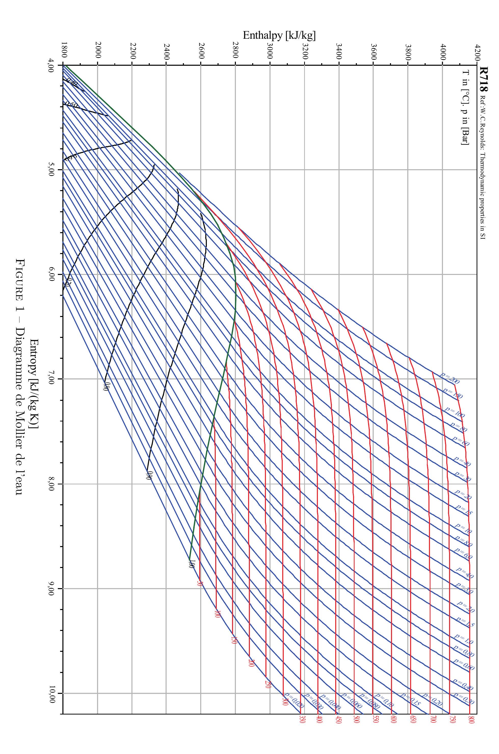 Le sujet est accompagné d'un document réponse contenant le graphe de l'enthalpie massique de l'eau en fonction de son entropie massique, appelé diagramme de Mollier, sur lequel figurent également les courbes isobares, isothermes, isotitres et la courbe de saturation du mélange liquide-vapeur.