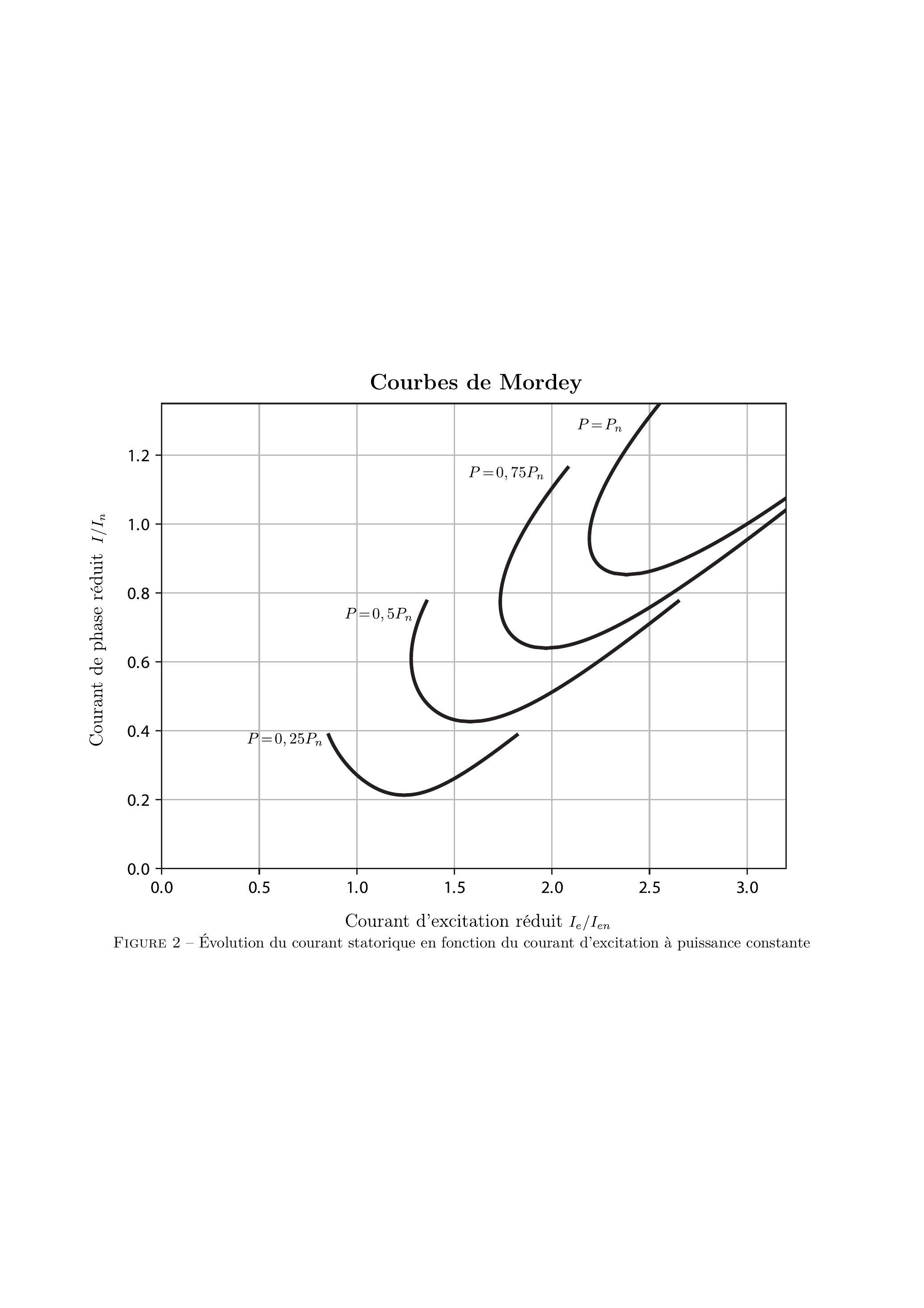 Sur le document réponse est reporté un réseau de courbes nommées courbes de Mordey donnant l'évolution du courant statorique en fonction en fonction du courant d'excitation pour un fonctionnement de l'alternateur à puissance moyenne constante.