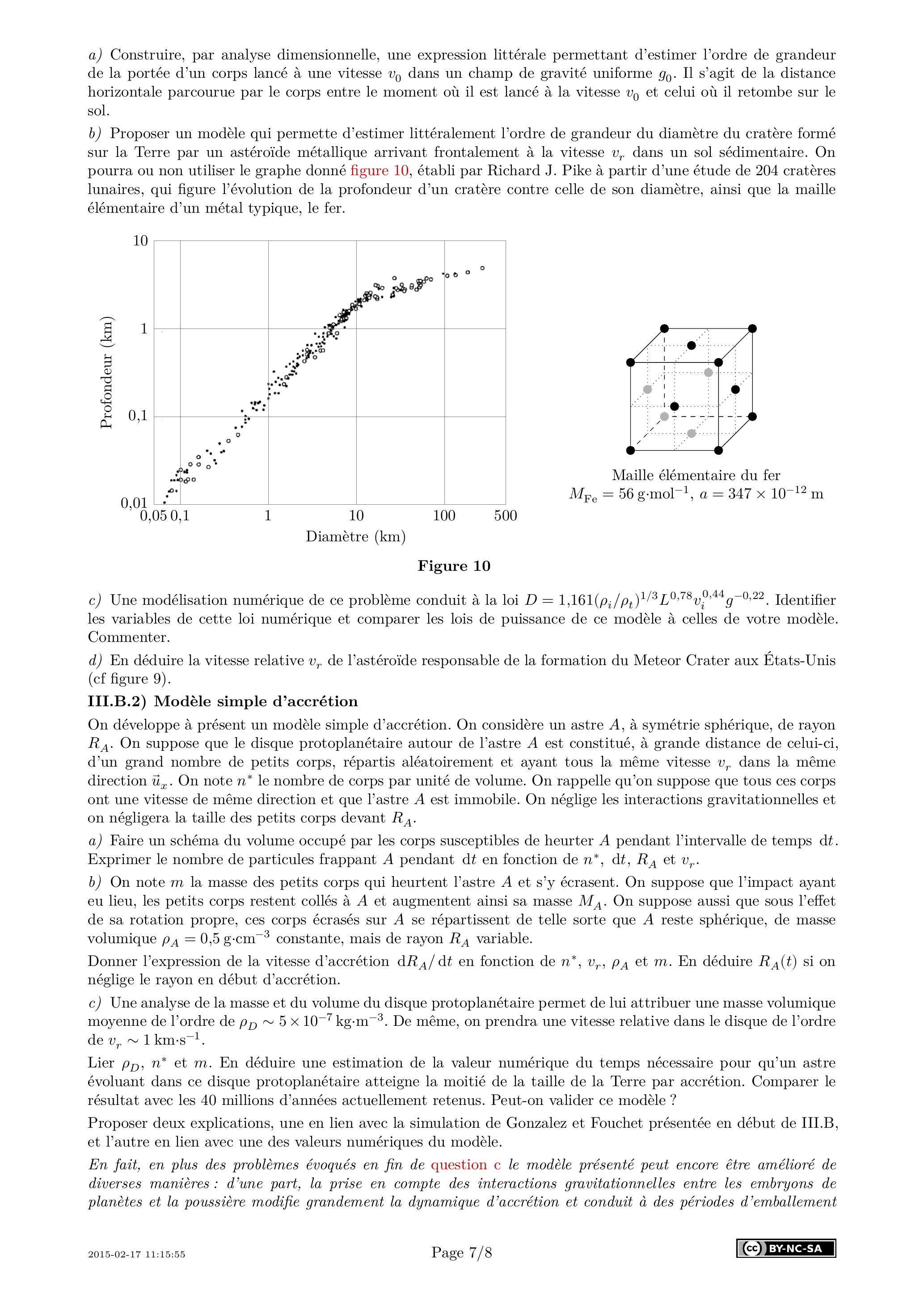 b) Proposer un modèle qui permette d'estimer littéralement l'ordre de grandeur du diamètre du cratère formé sur la Terre par un astéroïde métallique arrivant frontalement à la vitesse dans un sol sédimentaire. On pourra ou non utiliser le graphe donné figure 10, établi par Richard J. Pike à partir d'une étude de 204 cratères lunaires, qui figure l'évolution de la profondeur d'un cratère contre celle de son diamètre, ainsi que la maille élémentaire d'un métal typique, le fer.