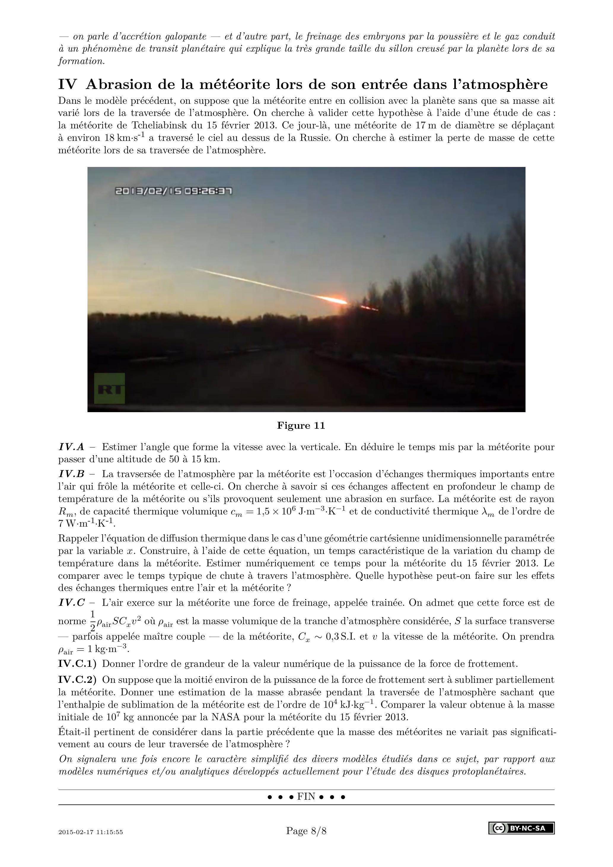 IV.C.2) On suppose que la moitié environ de la puissance de la force de frottement sert à sublimer partiellement la météorite. Donner une estimation de la masse abrasée pendant la traversée de l'atmosphère sachant que l'enthalpie de sublimation de la météorite est de l'ordre de . Comparer la valeur obtenue à la masse initiale de annoncée par la NASA pour la météorite du 15 février 2013.
