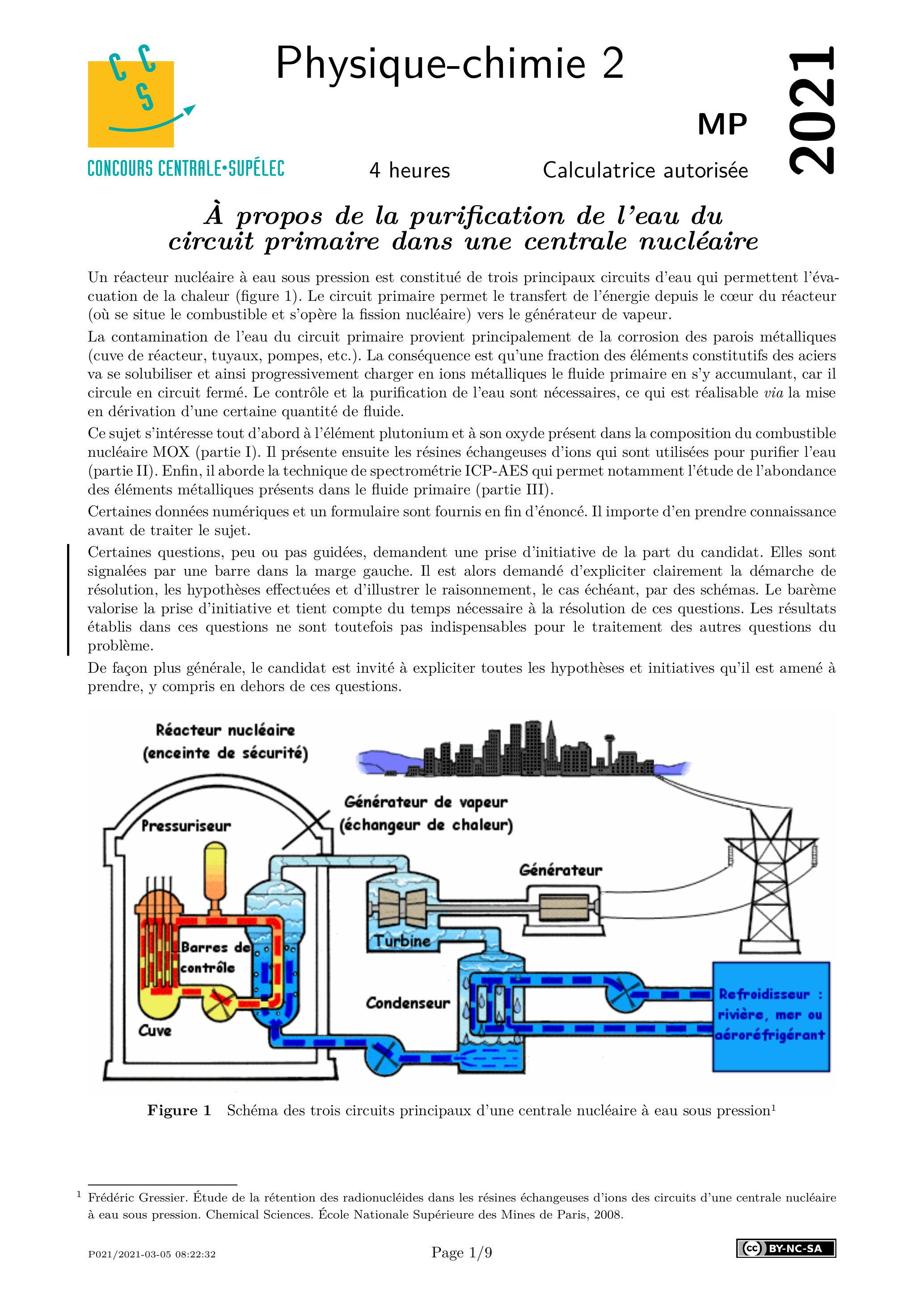 Ce sujet s'intéresse tout d'abord à l'élément plutonium et à son oxyde présent dans la composition du combustible nucléaire MOX (partie I). Il présente ensuite les résines échangeuses d'ions qui sont utilisées pour purifier l'eau (partie II). Enfin, il aborde la technique de spectrométrie ICP-AES qui permet notamment l'étude de l'abondance des éléments métalliques présents dans le fluide primaire (partie III).