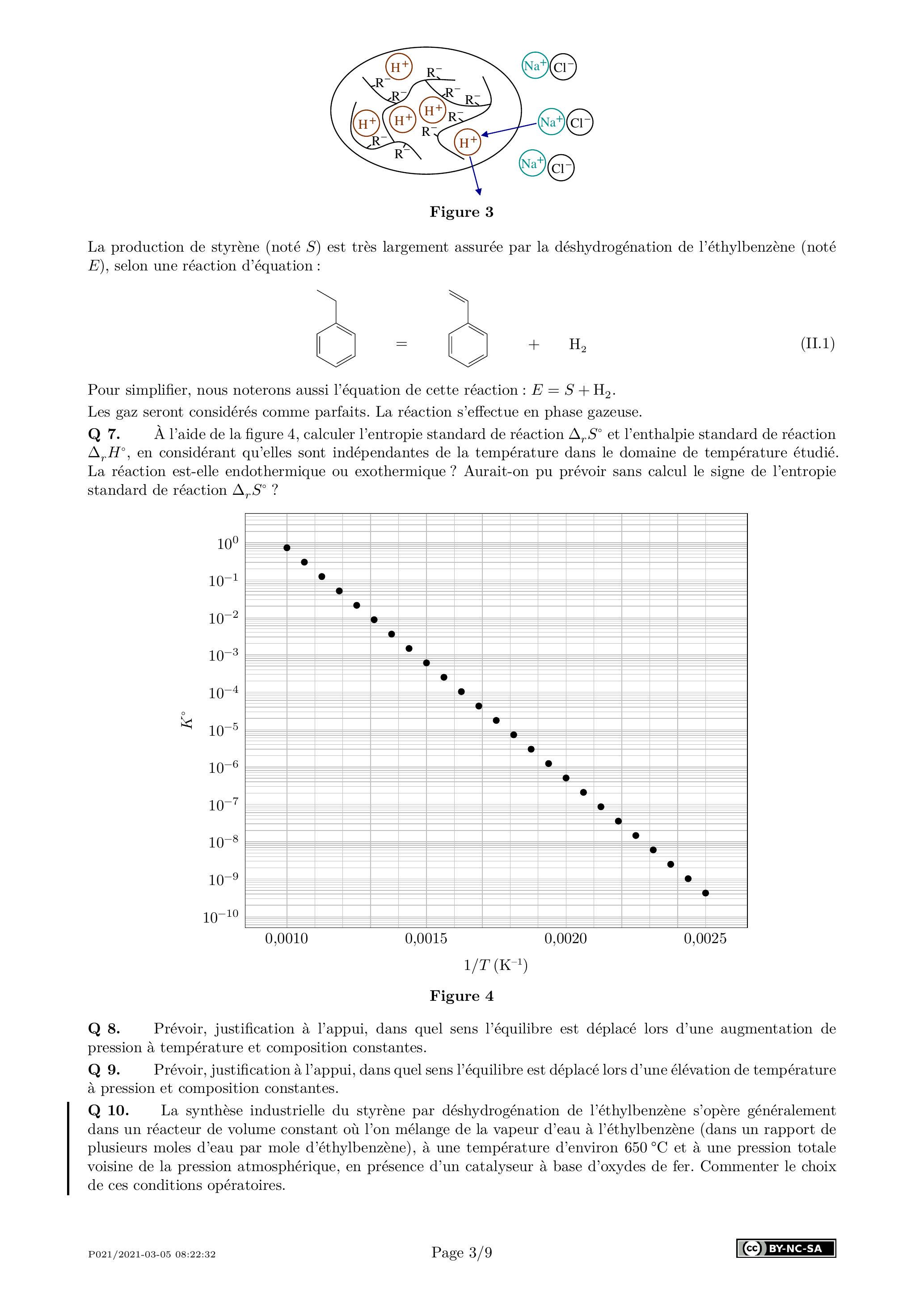 Q 10. La synthèse industrielle du styrène par déshydrogénation de l'éthylbenzène s'opère généralement dans un réacteur de volume constant où l'on mélange de la vapeur d'eau à l'éthylbenzène (dans un rapport de plusieurs moles d'eau par mole d'éthylbenzène), à une température d'environ et à une pression totale voisine de la pression atmosphérique, en présence d'un catalyseur à base d'oxydes de fer. Commenter le choix de ces conditions opératoires.