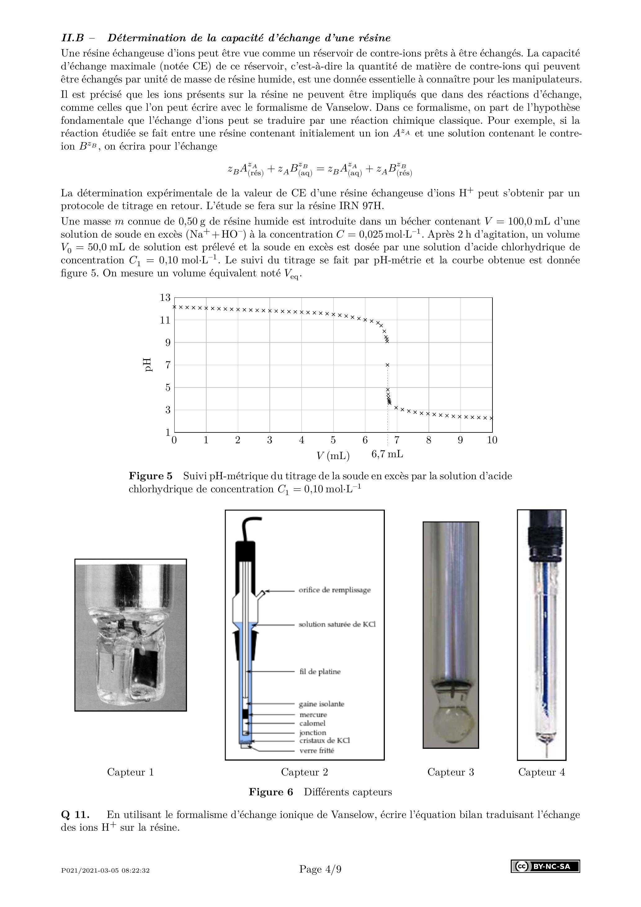 Q 11. En utilisant le formalisme d'échange ionique de Vanselow, écrire l'équation bilan traduisant l'échange des ions sur la résine.