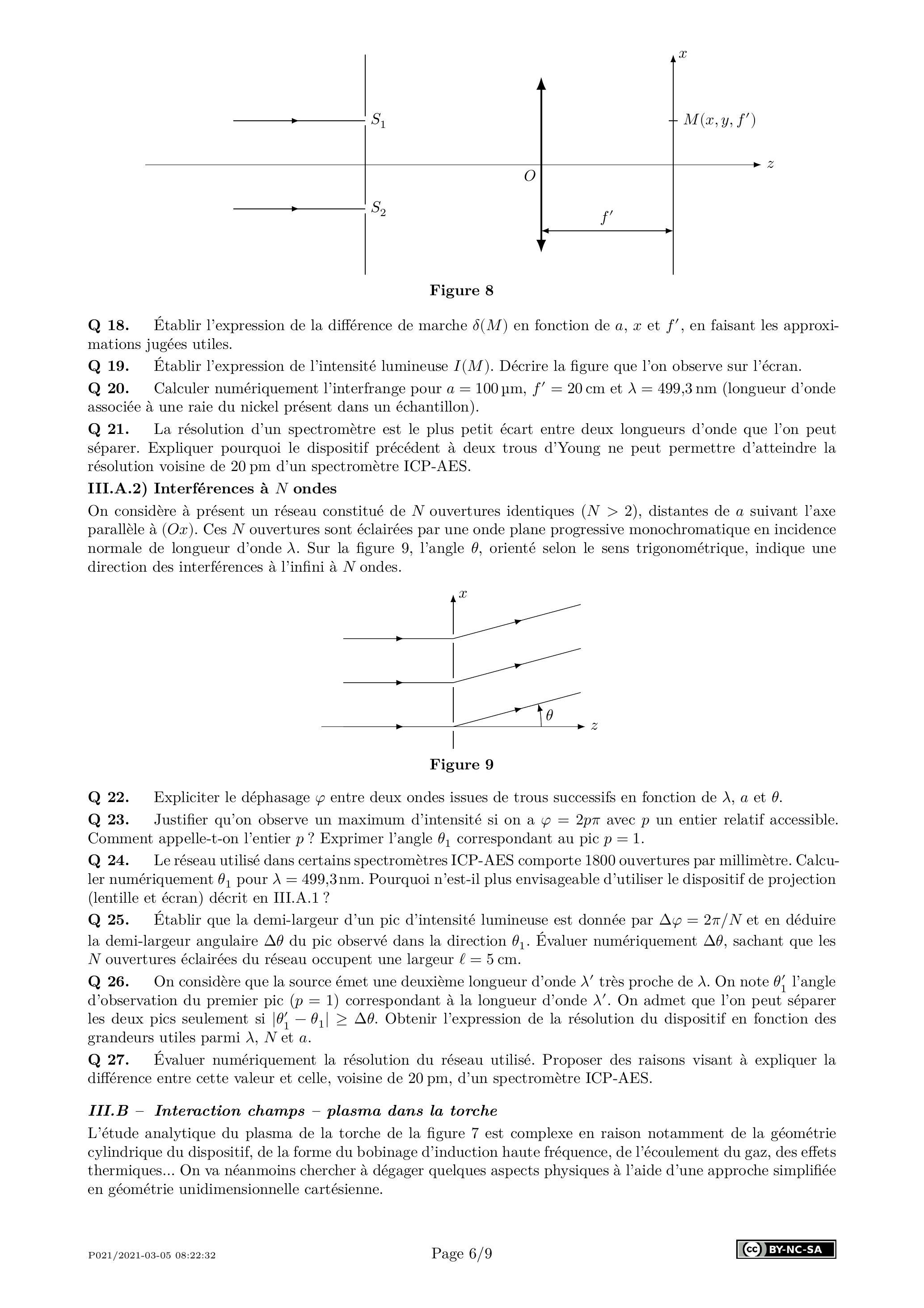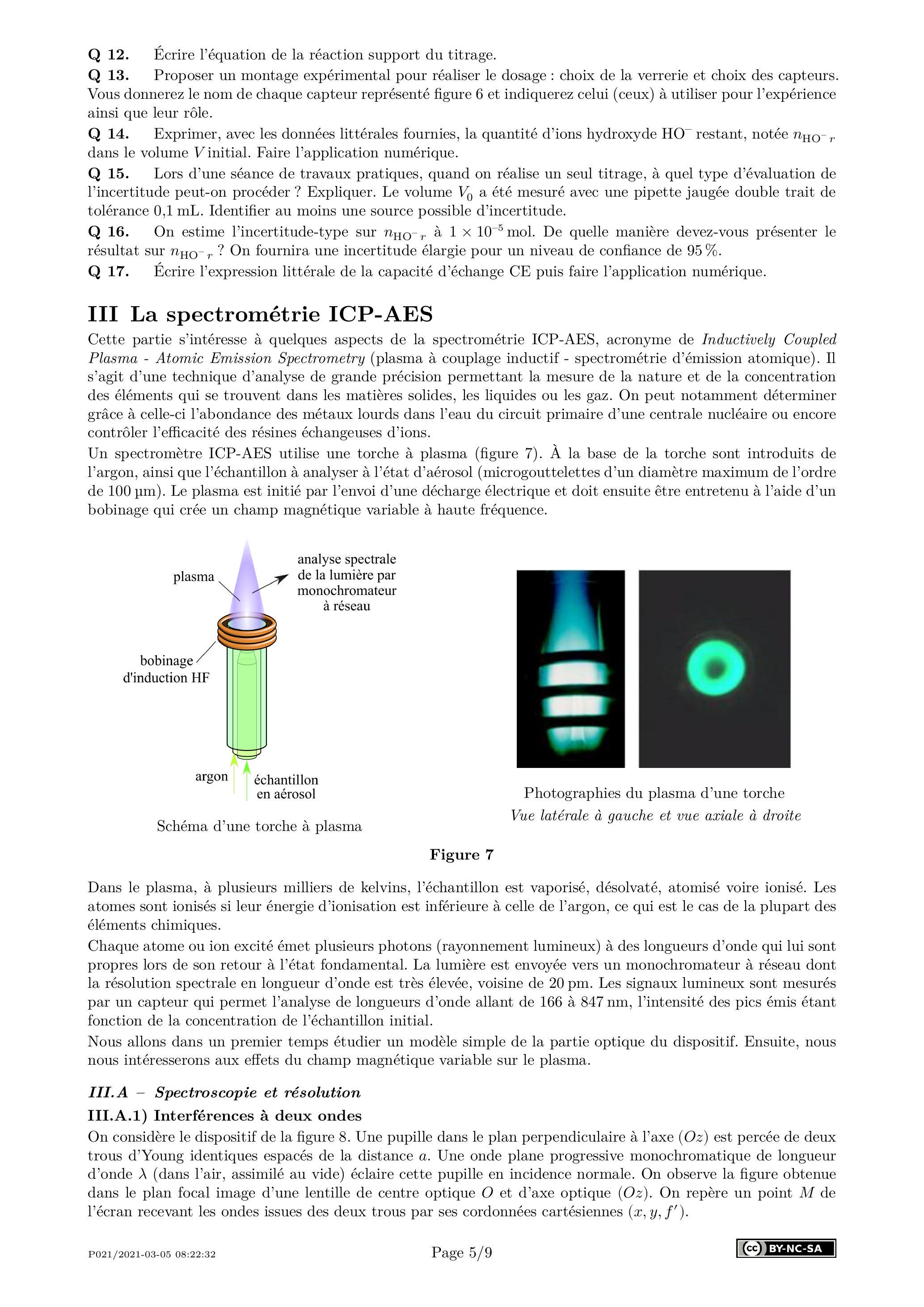 Q 21. La résolution d'un spectromètre est le plus petit écart entre deux longueurs d'onde que l'on peut séparer. Expliquer pourquoi le dispositif précédent à deux trous d'Young ne peut permettre d'atteindre la résolution voisine de 20 pm d'un spectromètre ICP-AES.