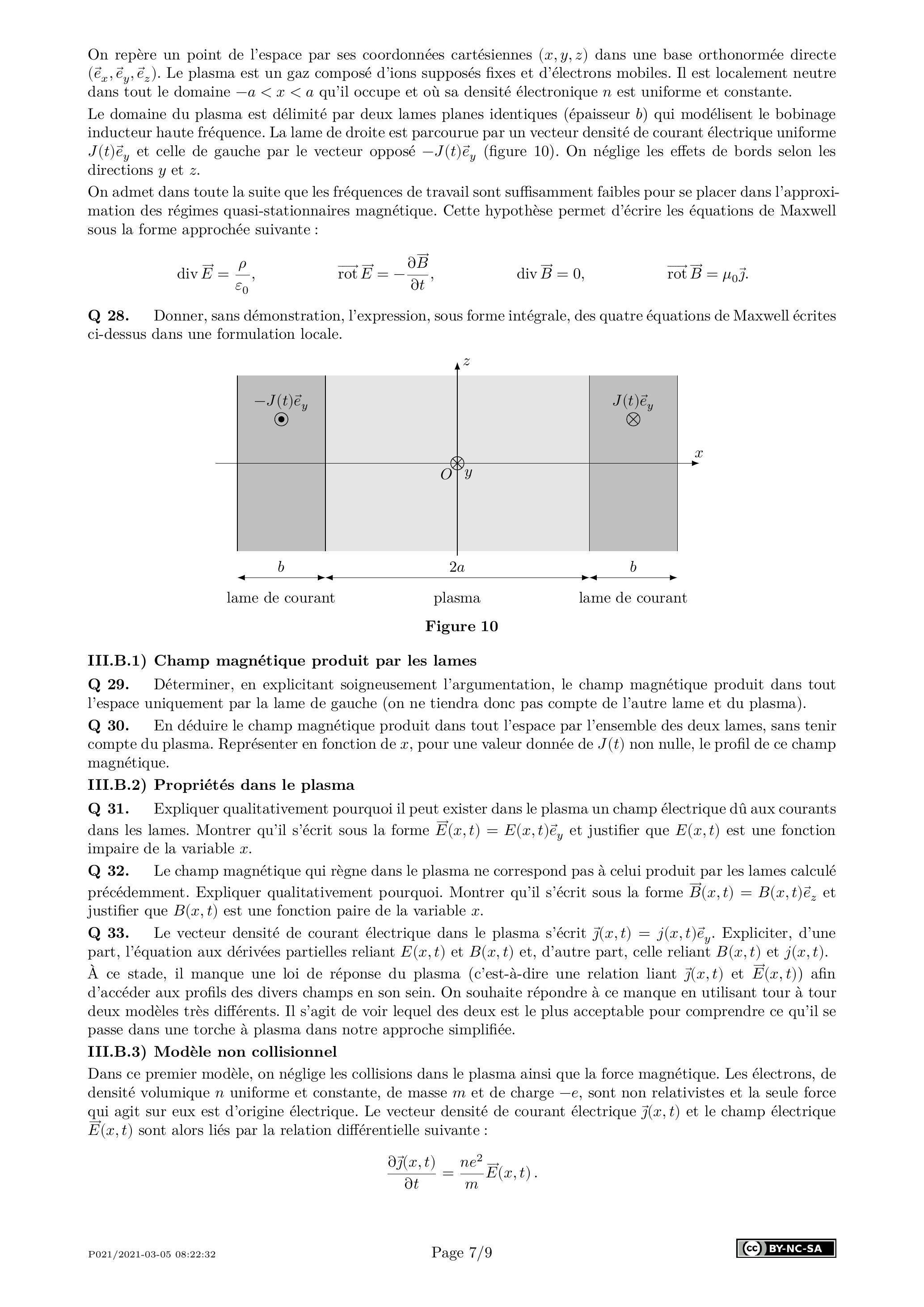 Q 31. Expliquer qualitativement pourquoi il peut exister dans le plasma un champ électrique dû aux courants dans les lames. Montrer qu'il s'écrit sous la forme et justifier que est une fonction impaire de la variable .