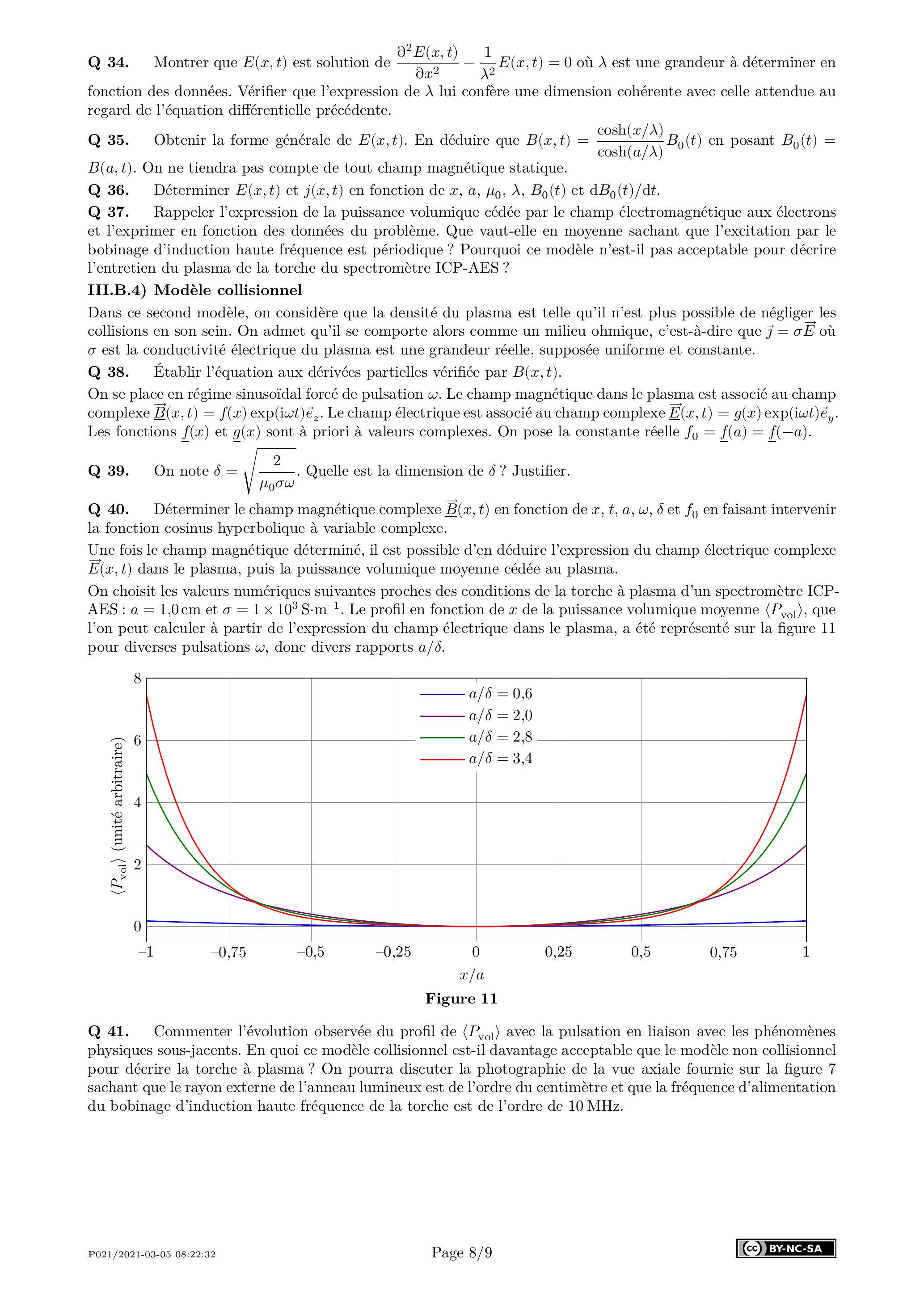 Q 37. Rappeler l'expression de la puissance volumique cédée par le champ électromagnétique aux électrons et l'exprimer en fonction des données du problème. Que vaut-elle en moyenne sachant que l'excitation par le bobinage d'induction haute fréquence est périodique ? Pourquoi ce modèle n'est-il pas acceptable pour décrire l'entretien du plasma de la torche du spectromètre ICP-AES ?
