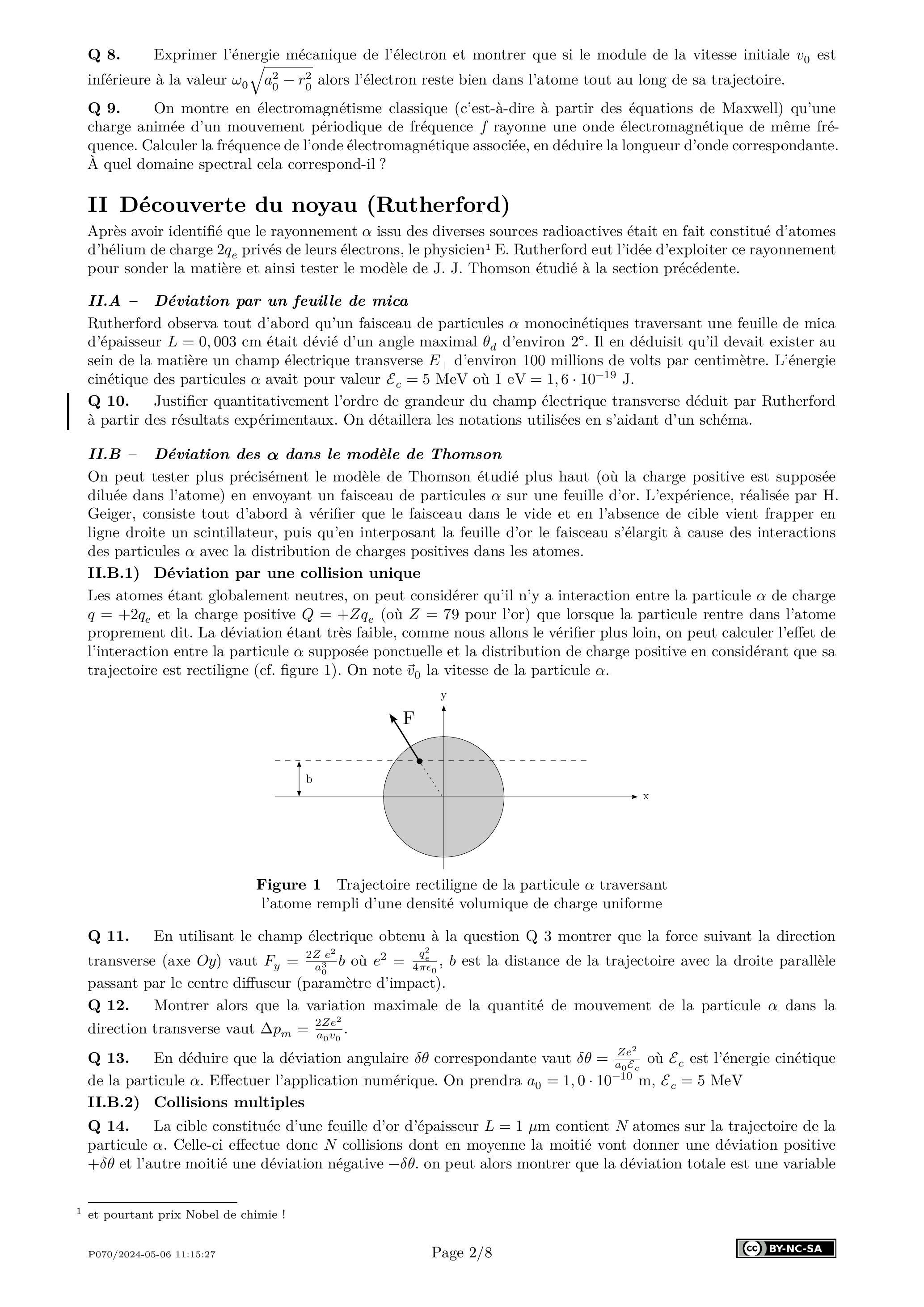Q 15. On considère le cas extrême d'une collision frontale et on supposera pour simplifier que l'atome est immobile compte tenu de sa masse importante par rapport aux particules . Montrer en utilisant la conservation de l'énergie mécanique que le noyau possède un rayon maximal vérifiant où est l'énergie cinétique initiale des particules .