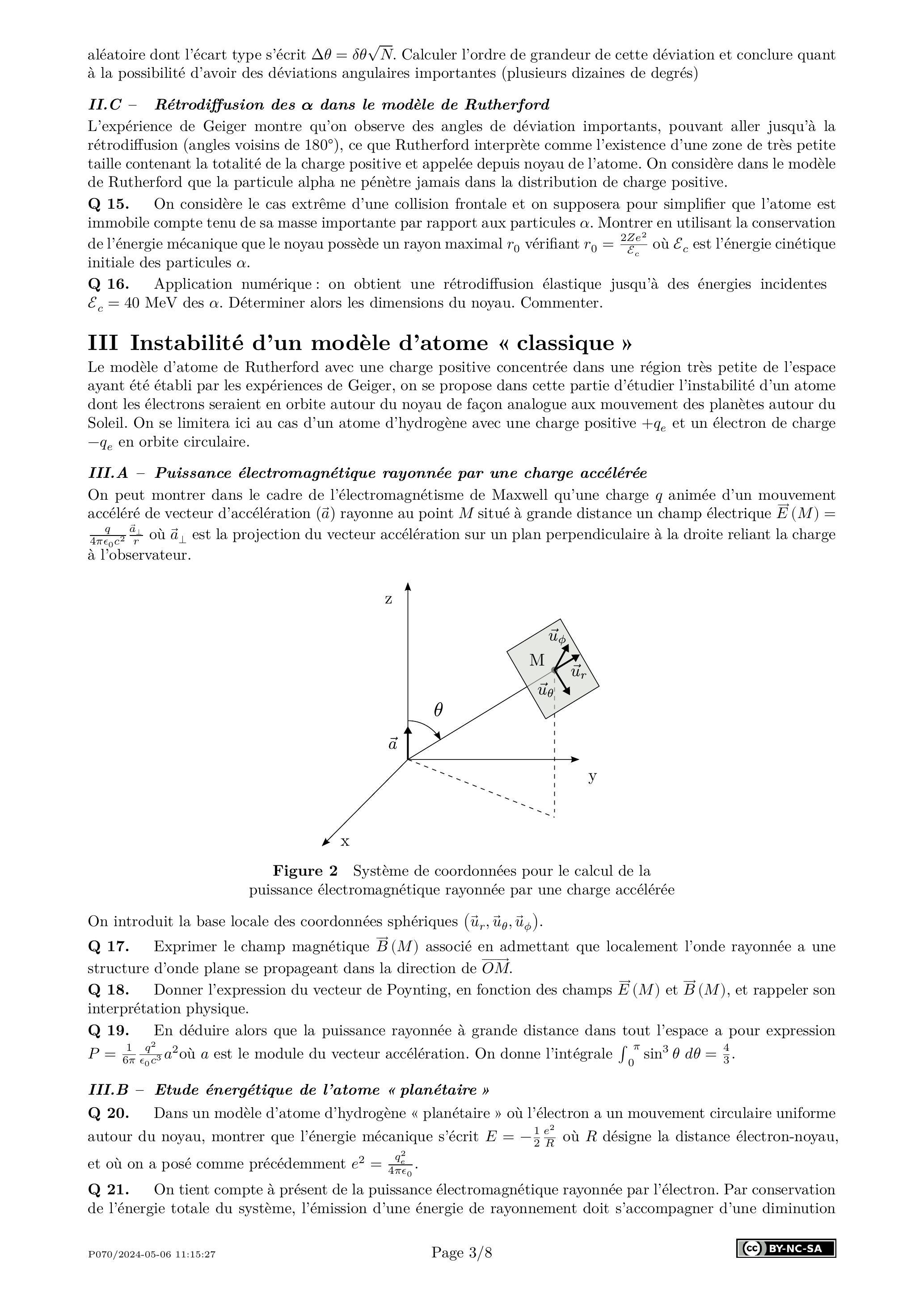 Q 21. On tient compte à présent de la puissance électromagnétique rayonnée par l'électron. Par conservation de l'énergie totale du système, l'émission d'une énergie de rayonnement doit s'accompagner d'une diminution