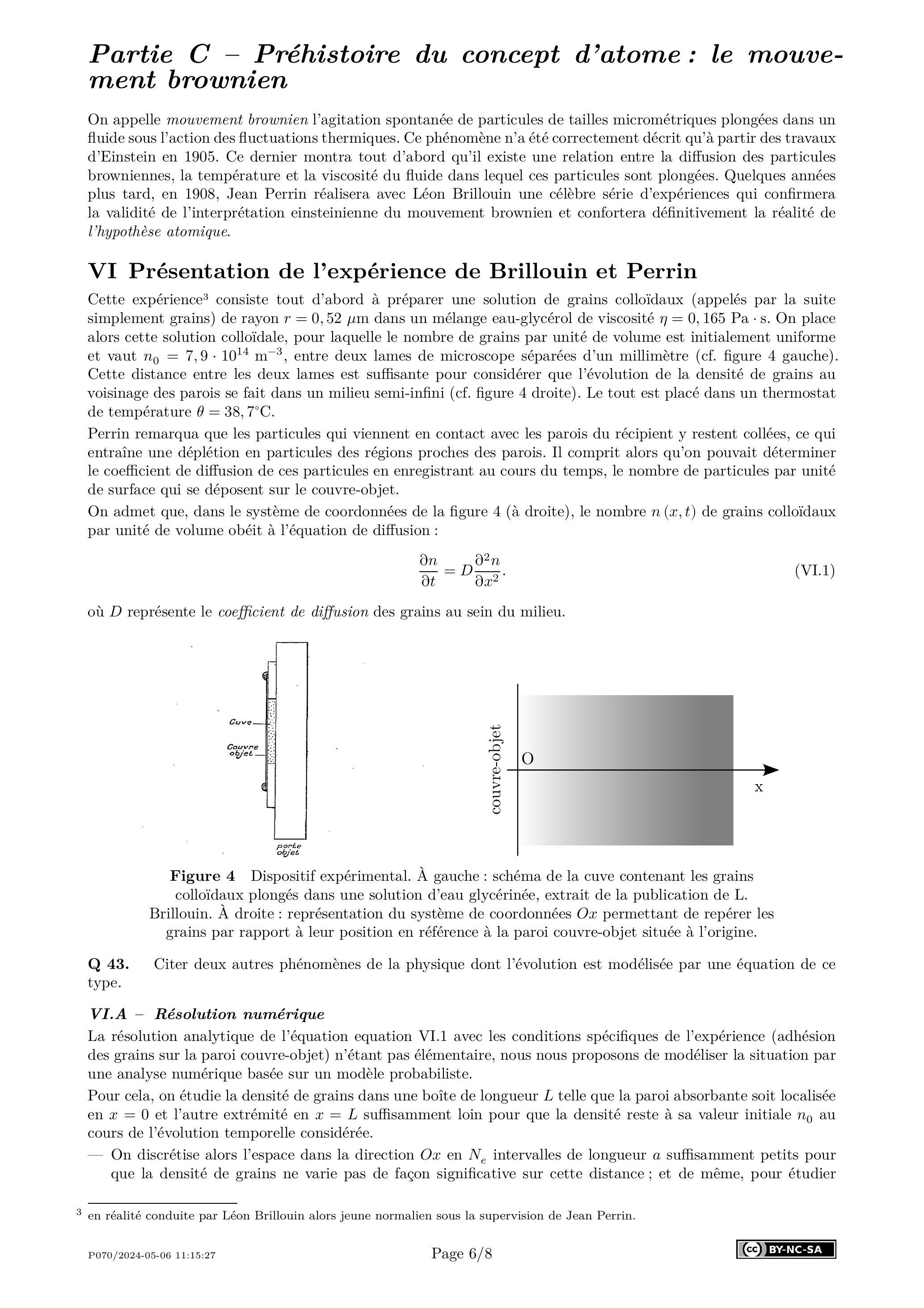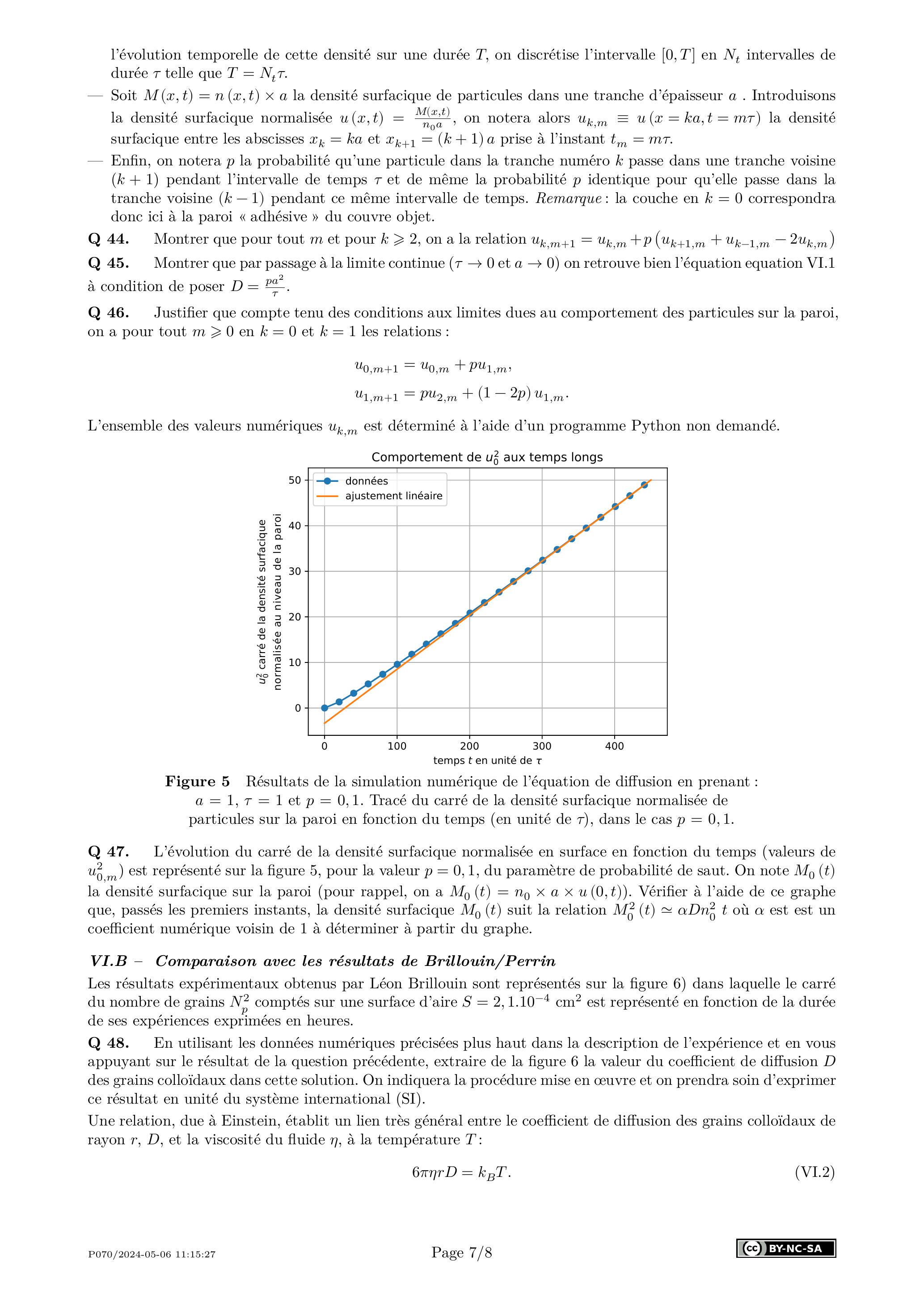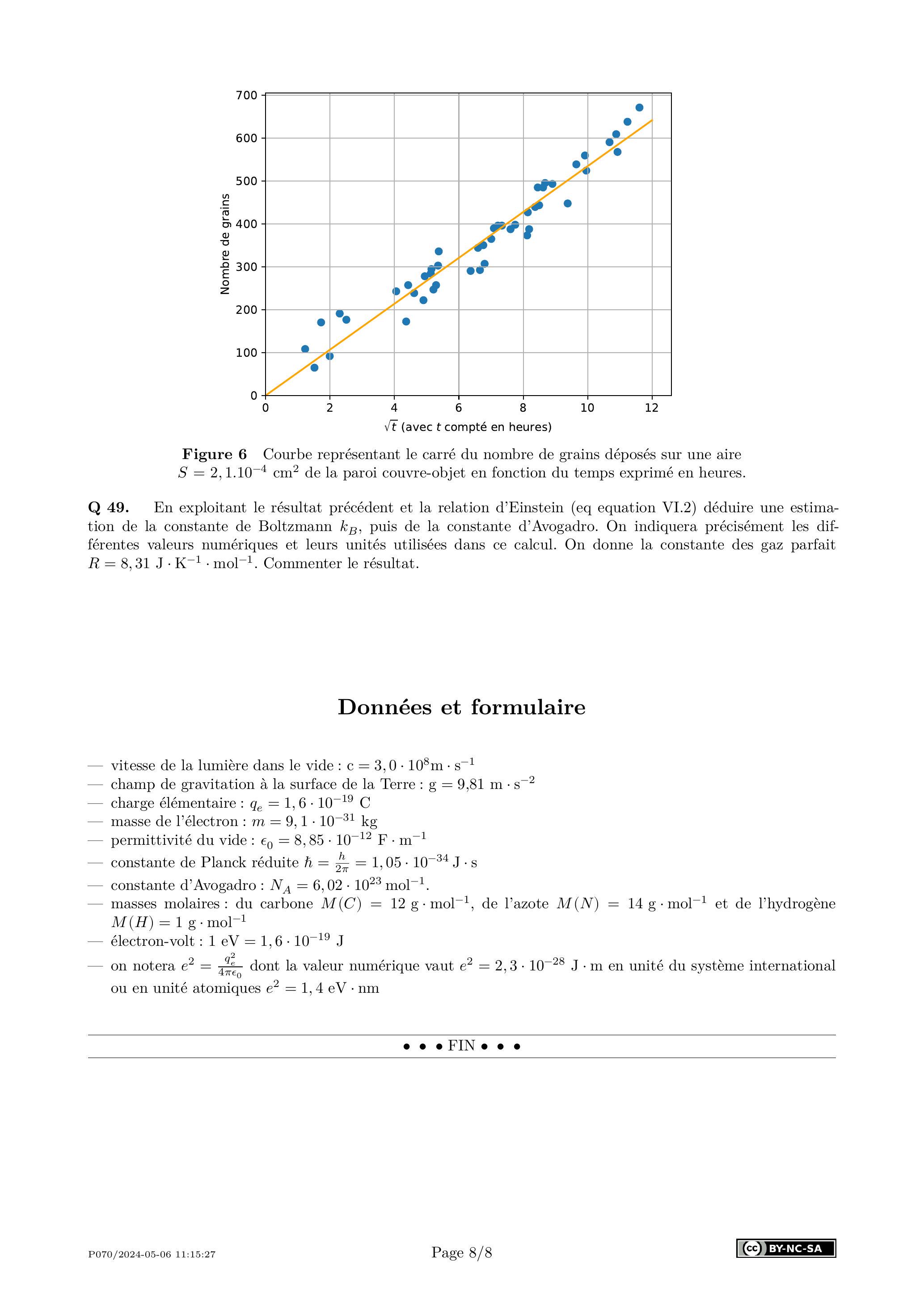 Q 49. En exploitant le résultat précédent et la relation d'Einstein (eq equation VI.2) déduire une estimation de la constante de Boltzmann , puis de la constante d'Avogadro. On indiquera précisément les différentes valeurs numériques et leurs unités utilisées dans ce calcul. On donne la constante des gaz parfait . Commenter le résultat.
