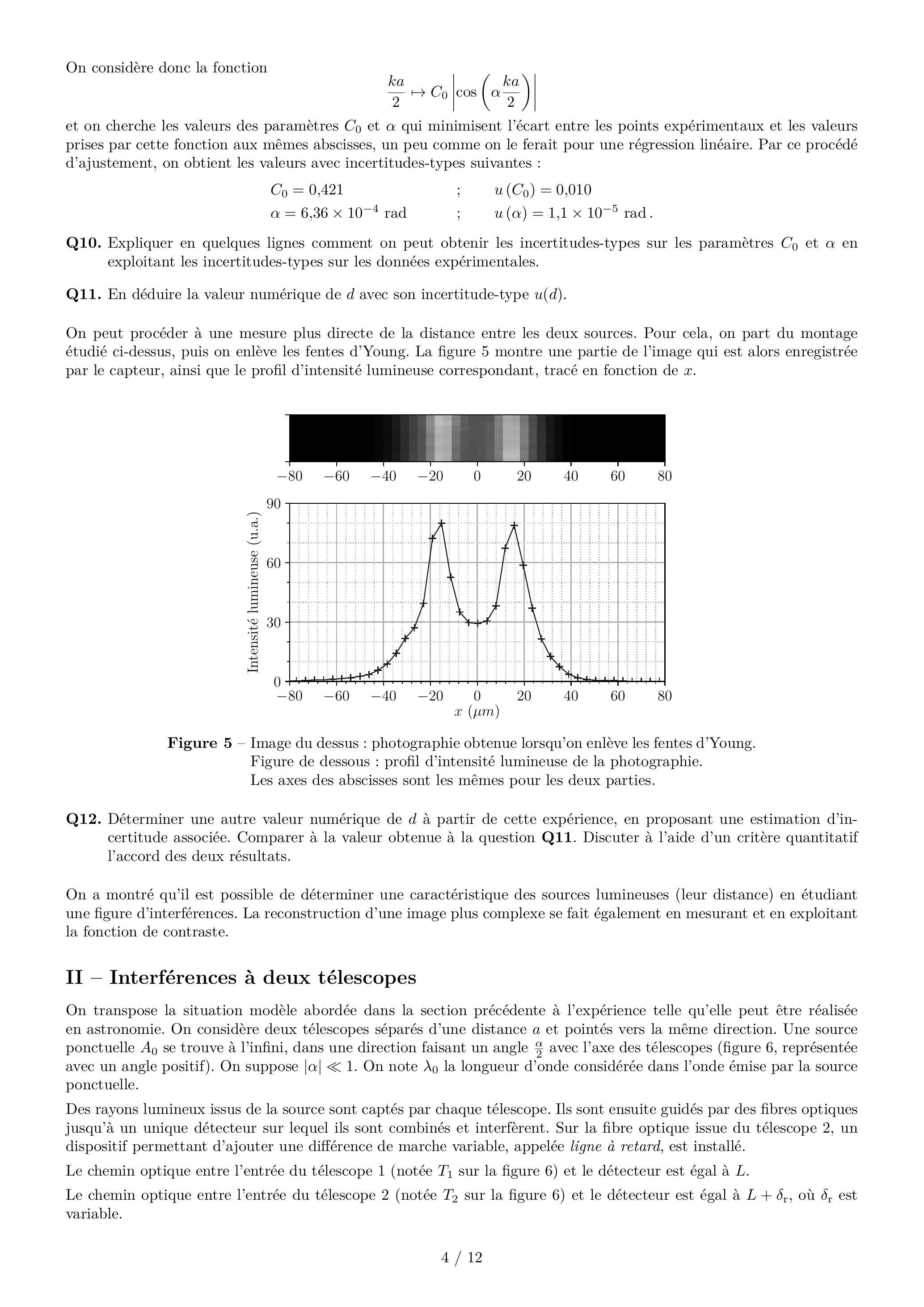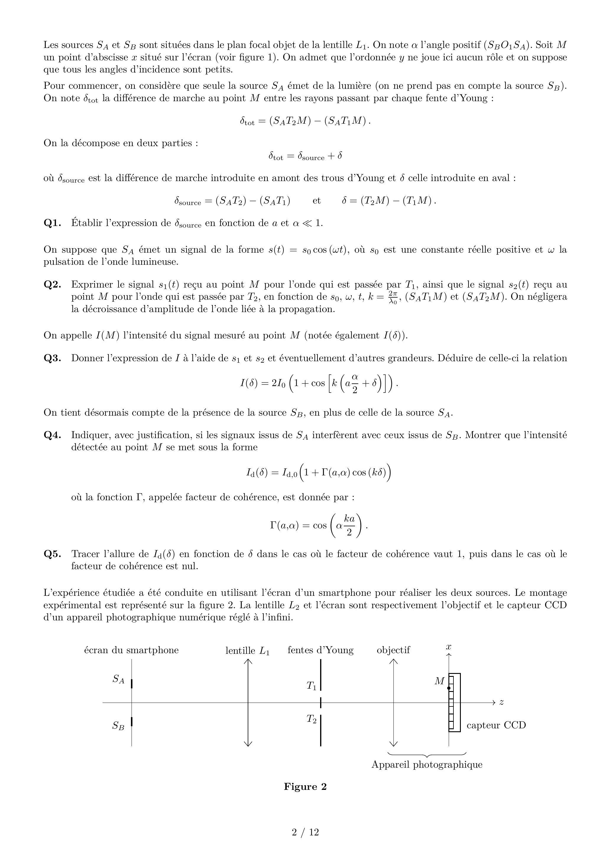 Les sources et sont situées dans le plan focal objet de la lentille . On note l'angle positif ( ). Soit un point d'abscisse situé sur l'écran (voir figure 1). On admet que l'ordonnée ne joue ici aucun rôle et on suppose que tous les angles d'incidence sont petits.