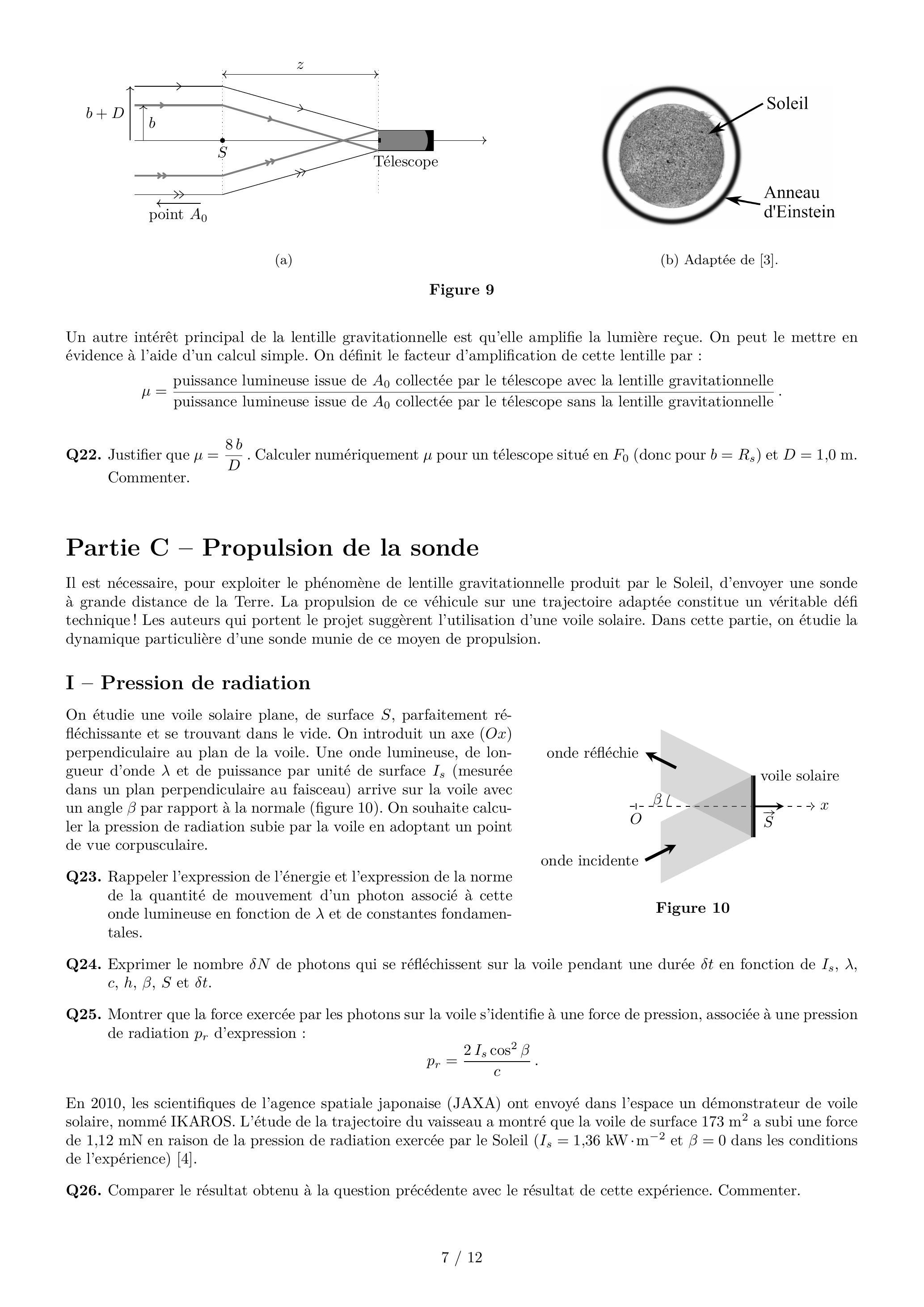 Il est nécessaire, pour exploiter le phénomène de lentille gravitationnelle produit par le Soleil, d'envoyer une sonde à grande distance de la Terre. La propulsion de ce véhicule sur une trajectoire adaptée constitue un véritable défi technique! Les auteurs qui portent le projet suggèrent l'utilisation d'une voile solaire. Dans cette partie, on étudie la dynamique particulière d'une sonde munie de ce moyen de propulsion.